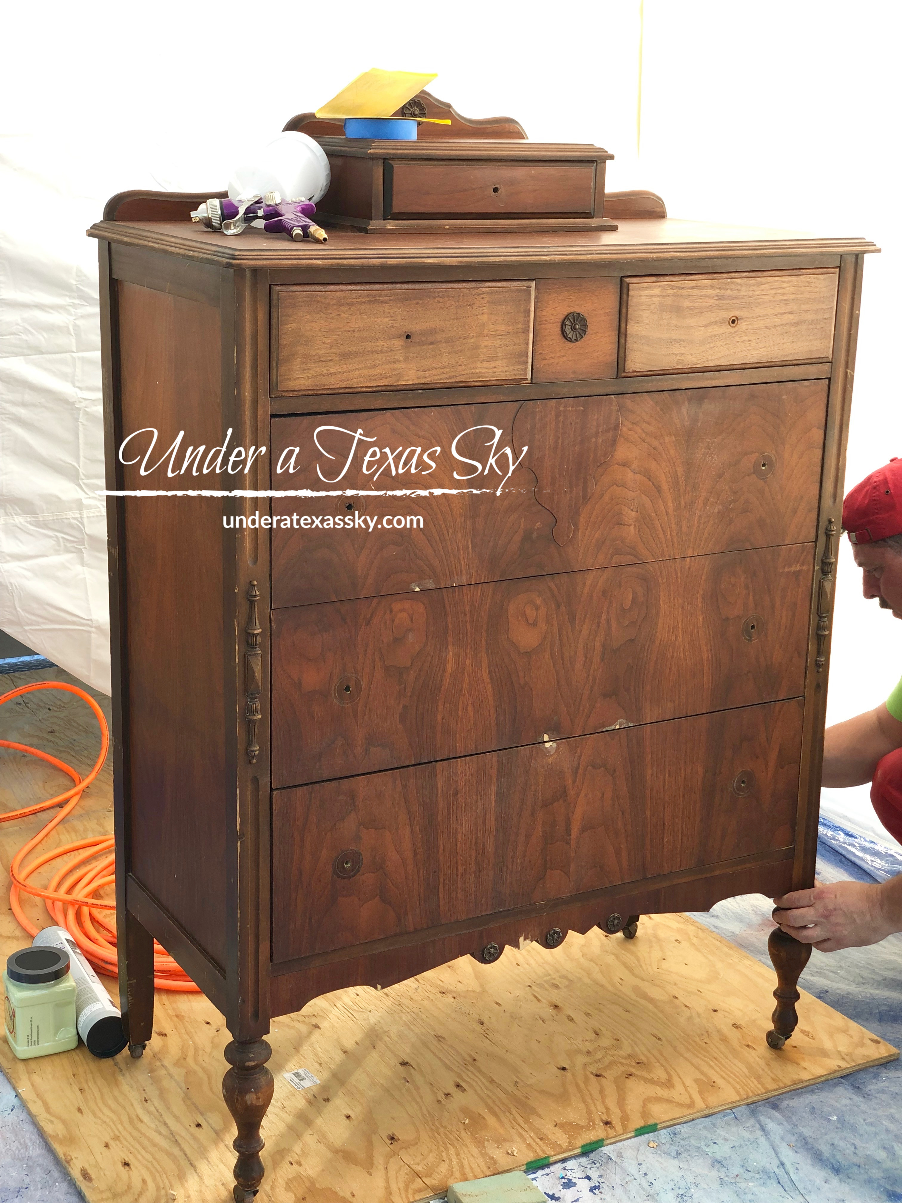 When tacking a larger piece of furniture, I like using a paint sprayer. This just makes the process much less time consuming. For this piece, The Mean Man used a gravity fed HPLV (high pressure low volume) paint sprayer. I think we gave less that $20 for this at Harbor Freight. If using a sprayer, you definitely need to dilute your Dixie Belle paint. Use about two ounces of water to eight ounces of paint. Dixie Belle paint is beautifully thick and it won’t flow through your sprayer easily unless you do this. Apply two coats. Even though this paint sprayer doesn’t have a ton of over spray, we still paint in a paint tent.