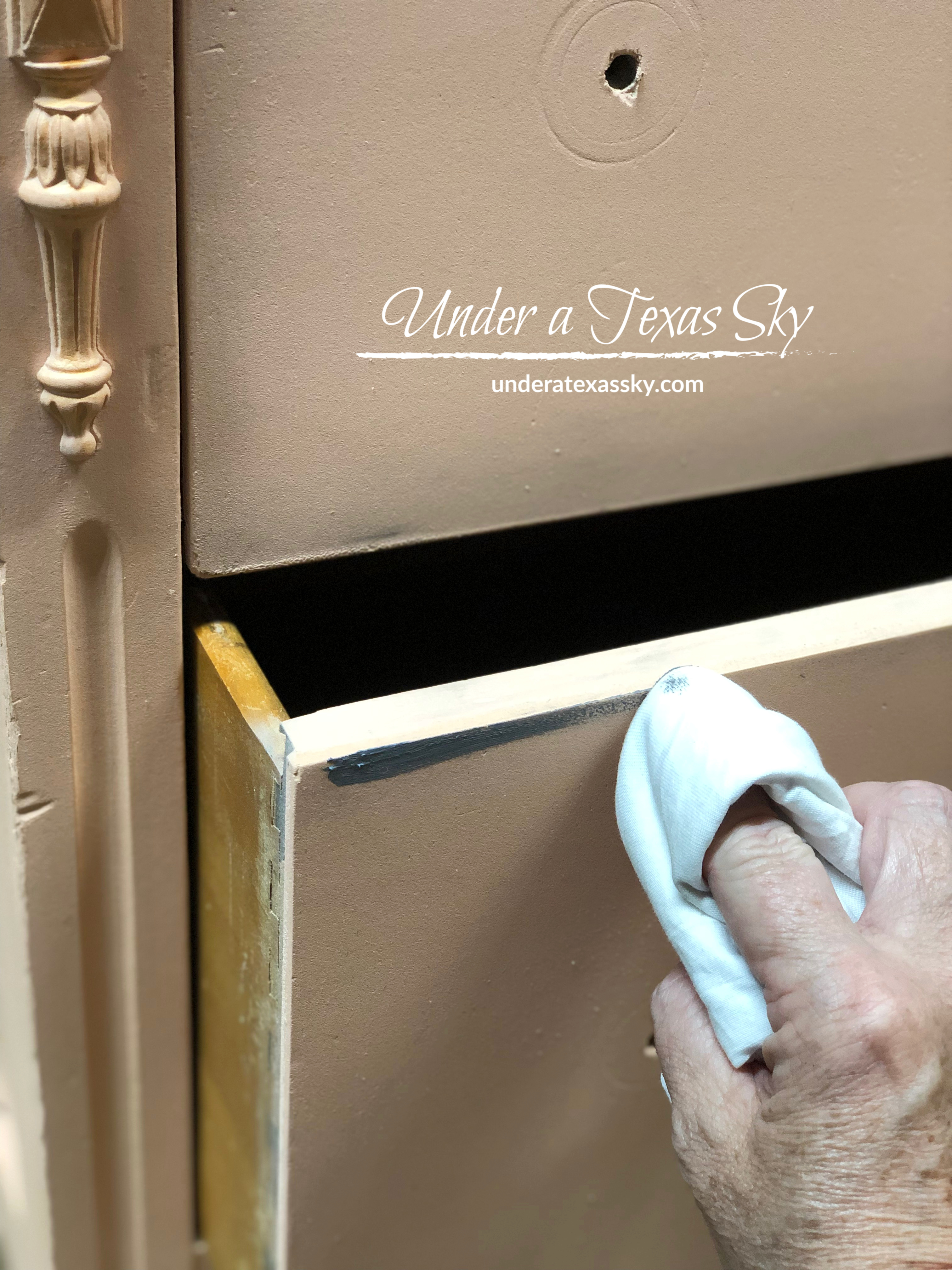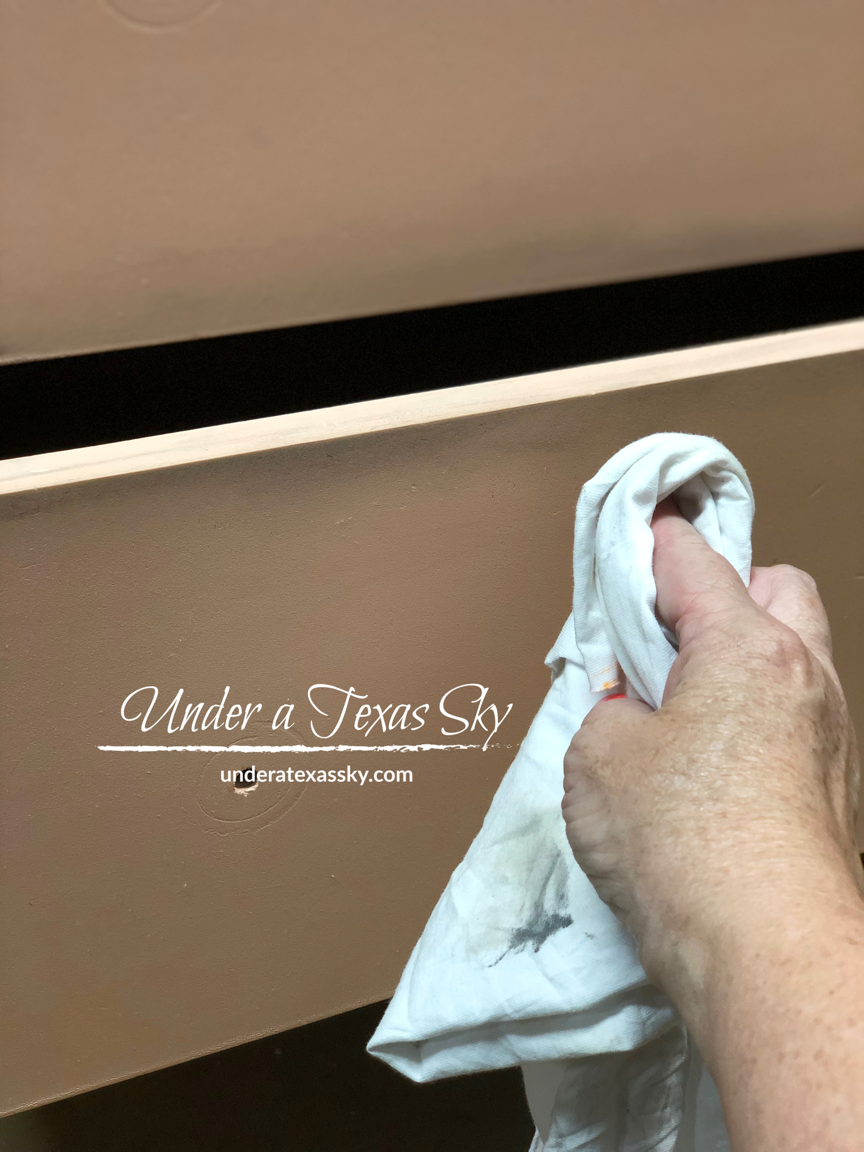 If you have sticky drawers (wow that sounds gross); I mean if the drawers don’t glide well, go ahead and fix those runners. Our drawers were aligned fine, but didn’t glide as smoothly as I’d like. This piece also smelled like old lady. Now, I’m an old lady, but some old ladies wear old lady perfume and I’m not at all fond of that smell. So I took care of two problems at once. You can take a wax melt (you know the ones you use to make your house smell wonderful) and rub it along the glides on the bottom of the drawers and the inner glides as well. The drawers will not only glide smoother, your piece will take on the fragrance of the wax melt.