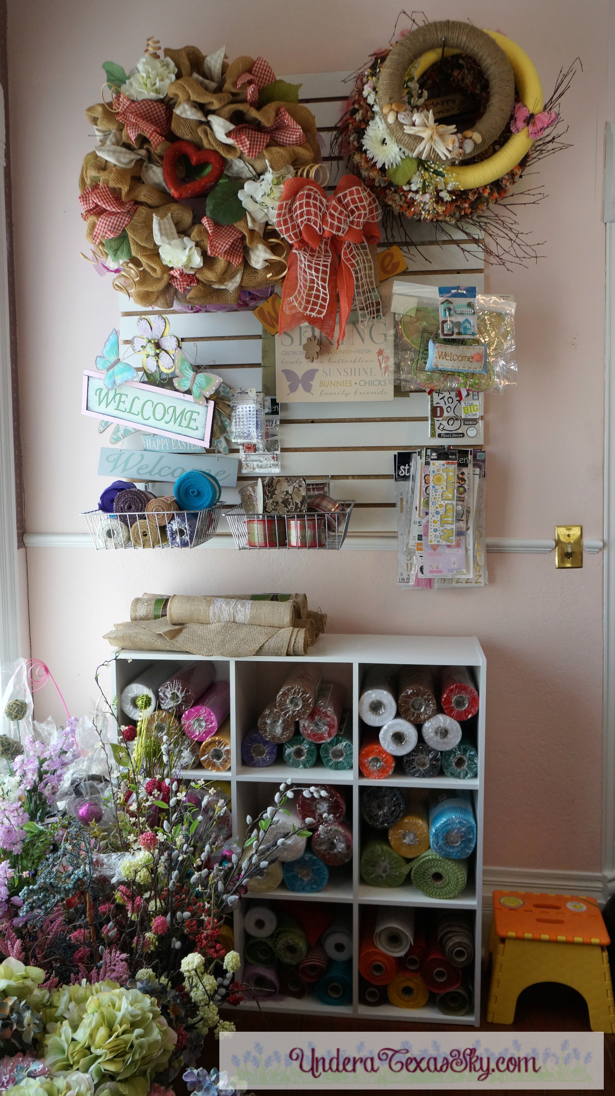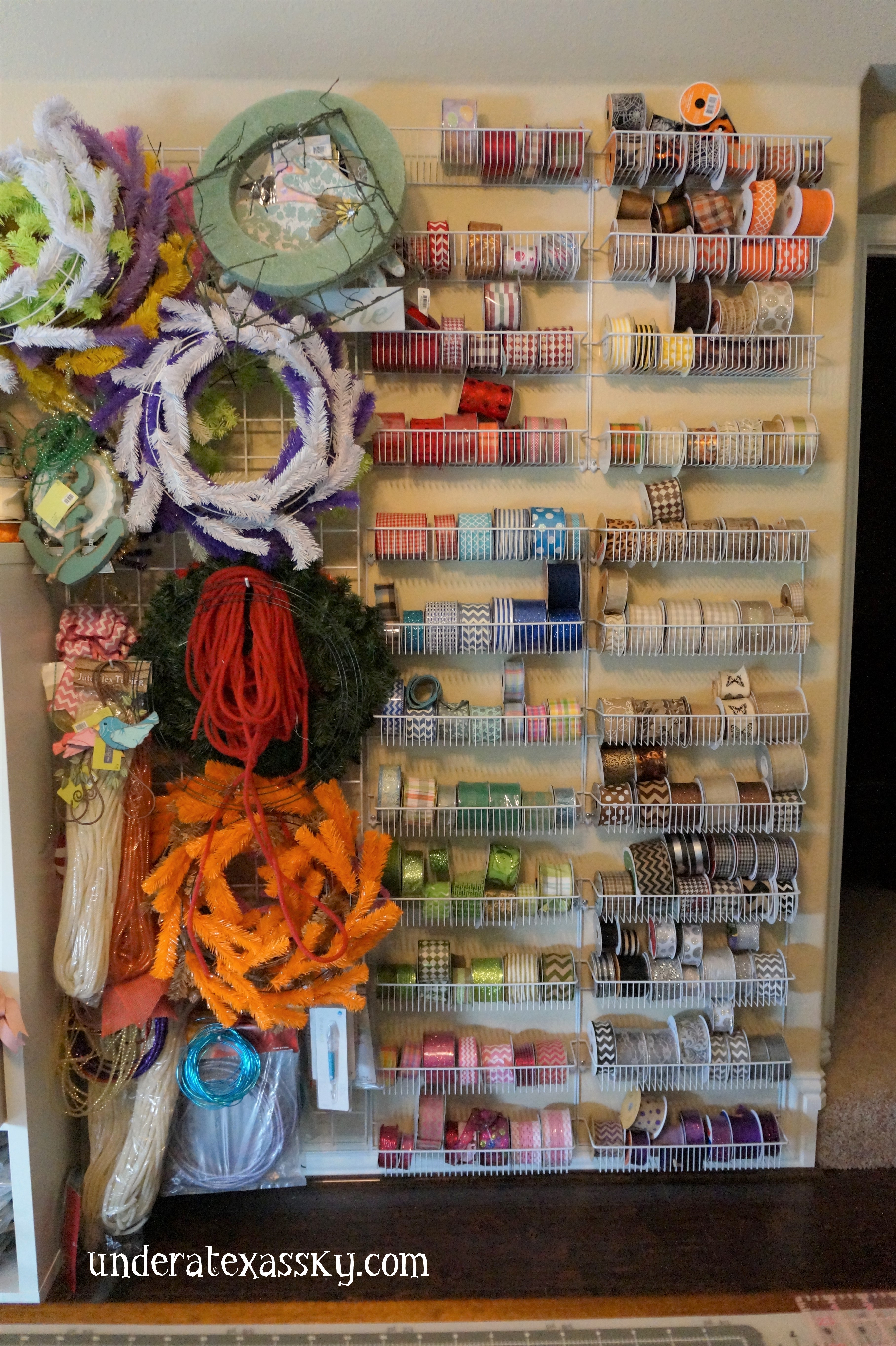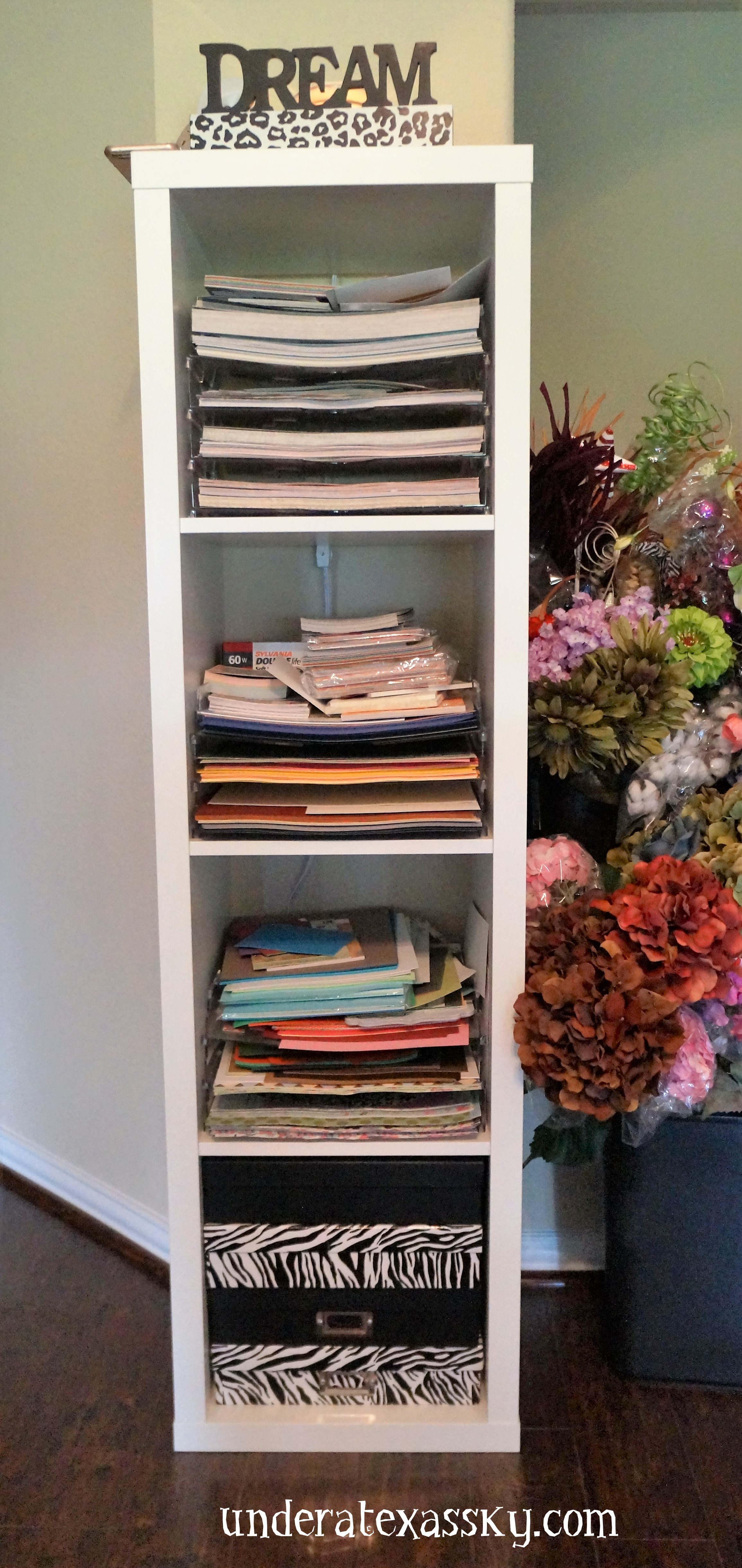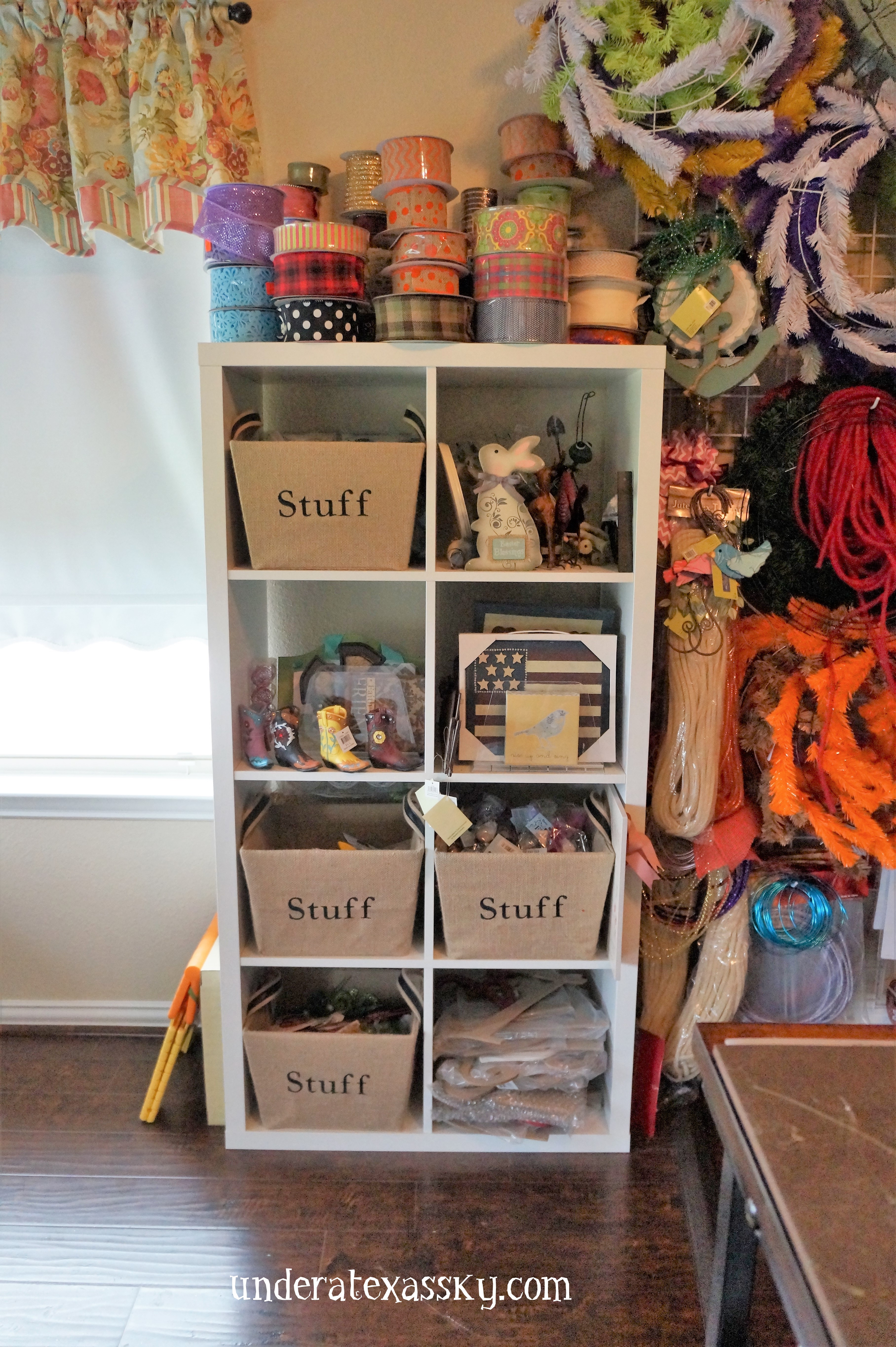 Ikea makes taller cubbies that are perfect for storing everything from scrapbook papers (I have racks and racks) to every little embellishment you may be storing for making wreaths. We use a double sided unit with a single next to it. I stack my bigger rolls of ribbon on top.