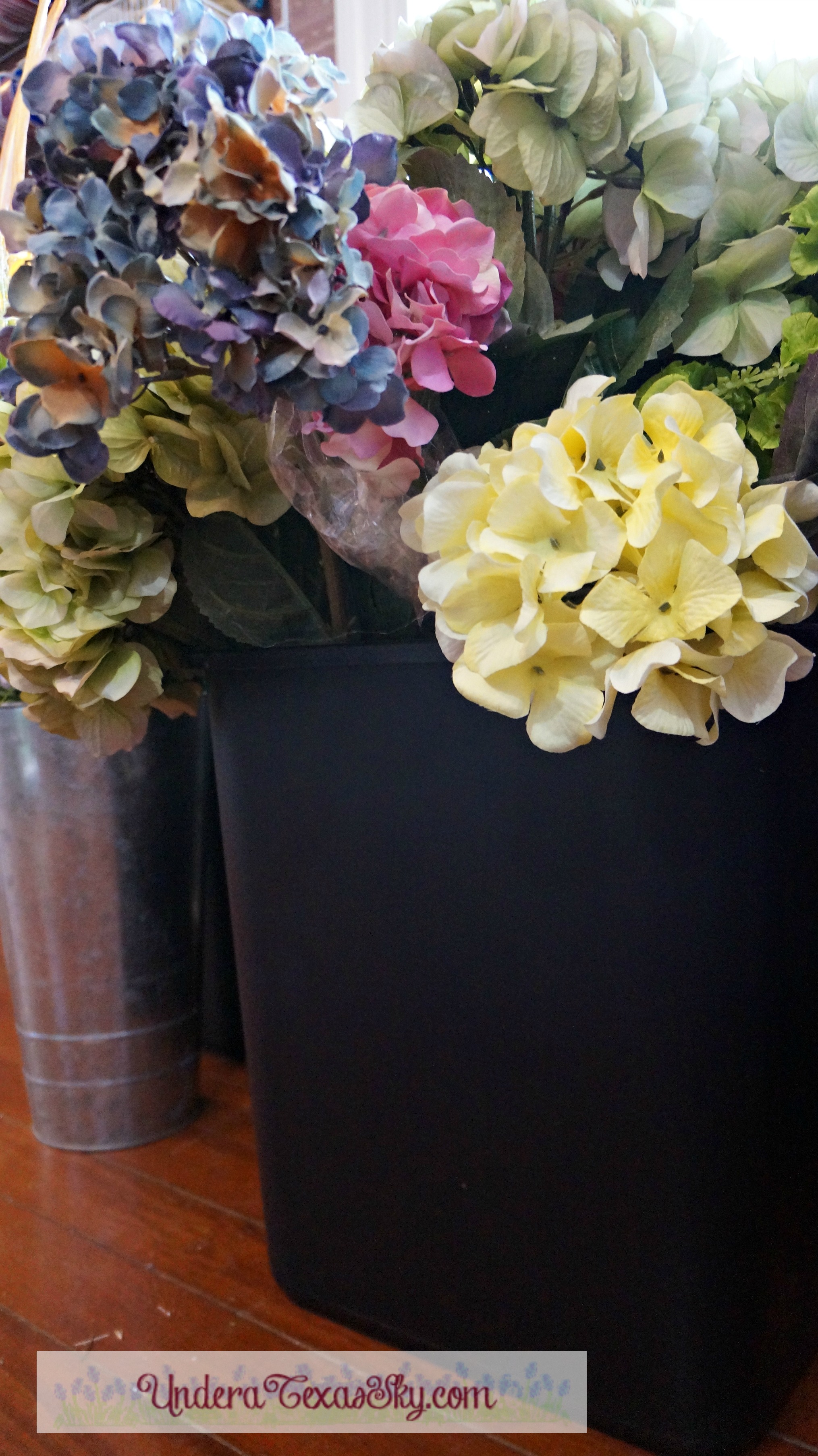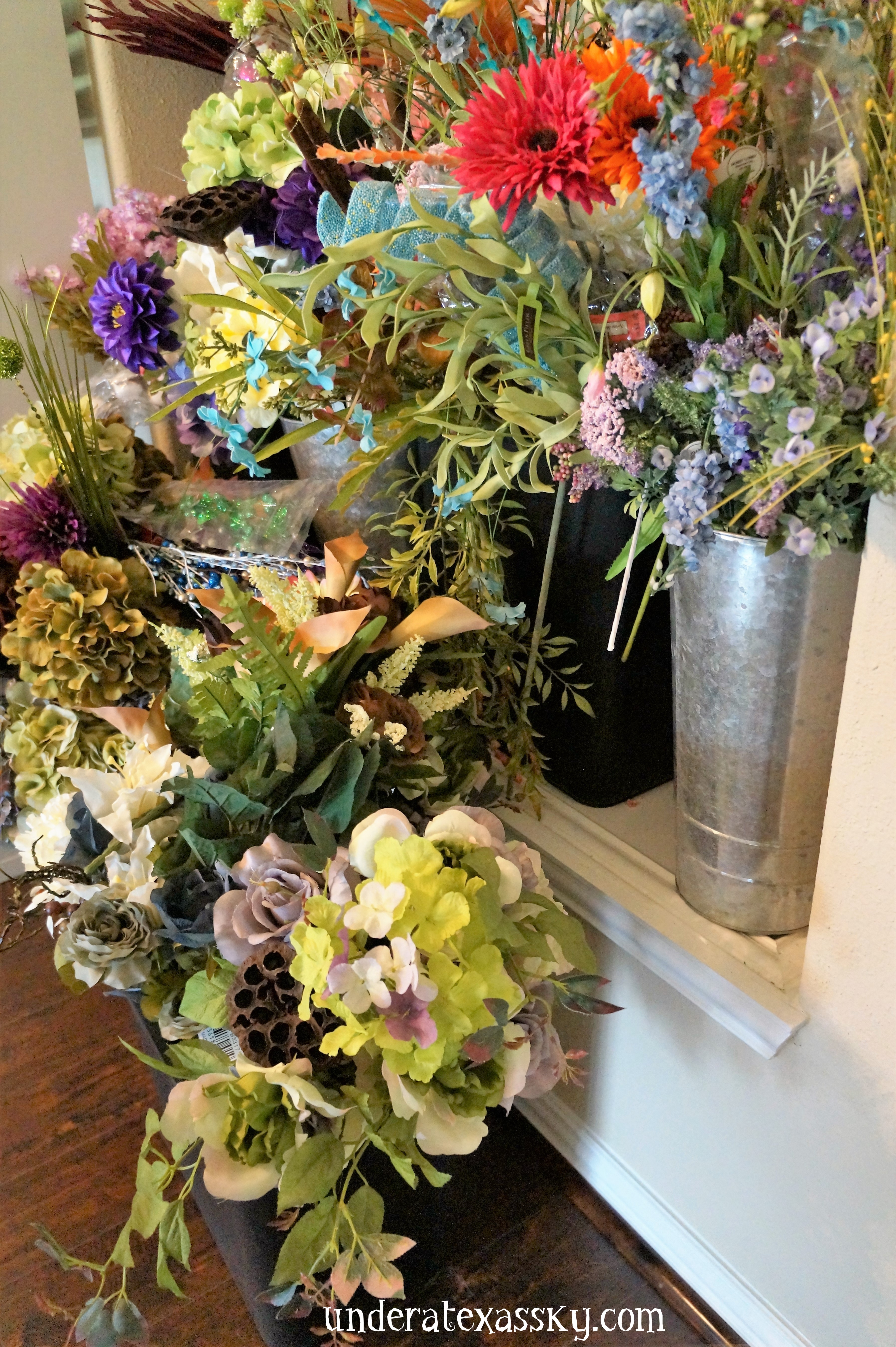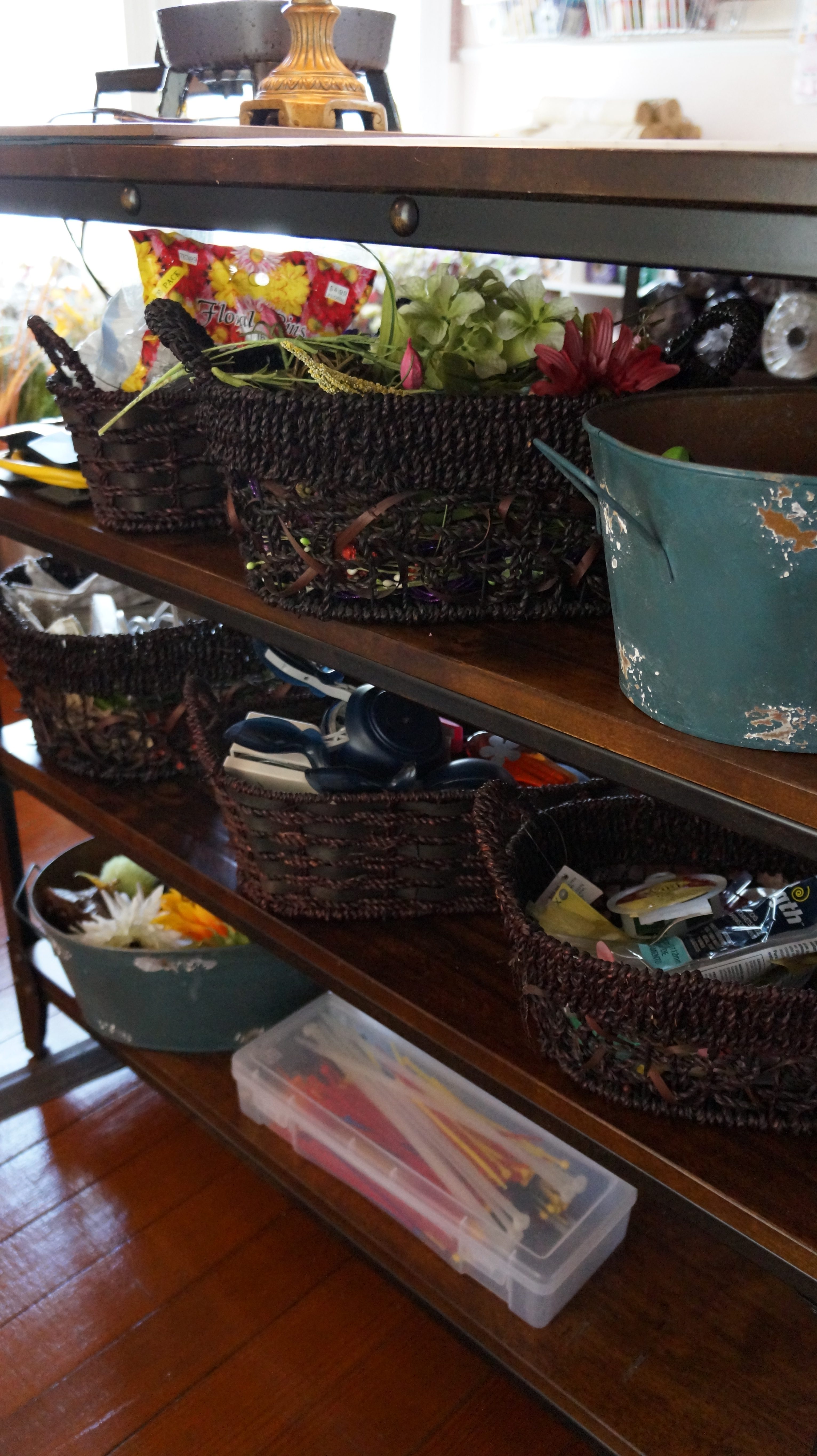If you’re a wreath maker like me, you undoubtedly have more flowers than you know what to do with. I buy lots of flowers at the end of each season when they are on sale for 75% off. Sales like that are my favorite. But flowers are not easily stored to where you can access them and be able to see what all you actually have. My first solution was to use the tall round tin buckets. The only problem with them is that they have a small base which makes them easy to tip over. Since I already had them, I still used them, but I purchased short waste baskets for the majority of my florals. Seriously, trash cans. In my old craft room I had a nice ledge that gave me stackable space. We’ll add a ledge at some point.