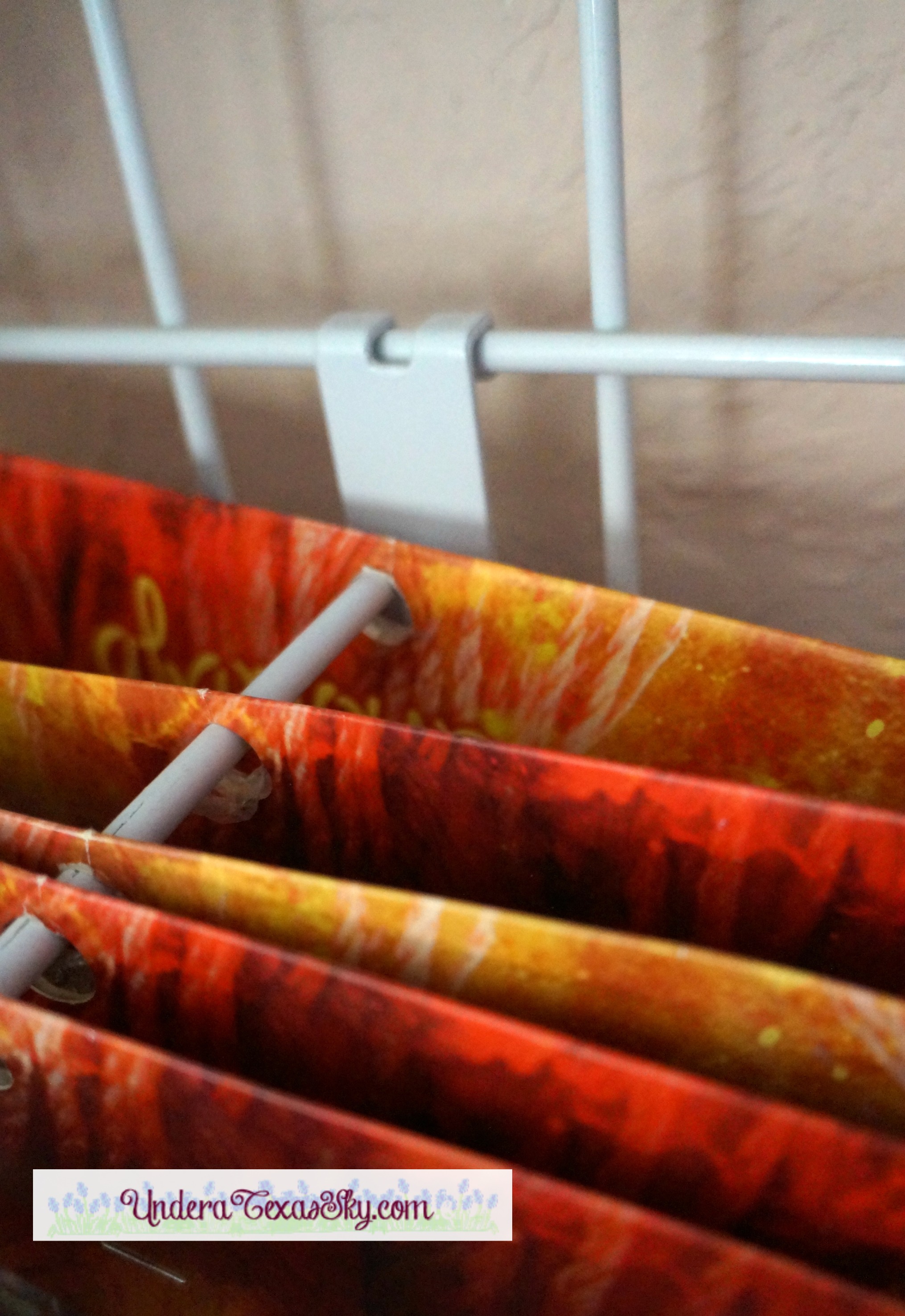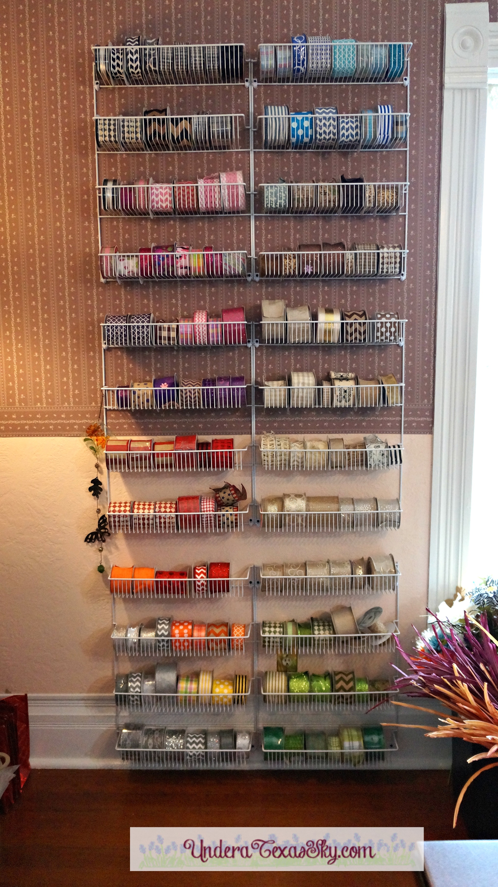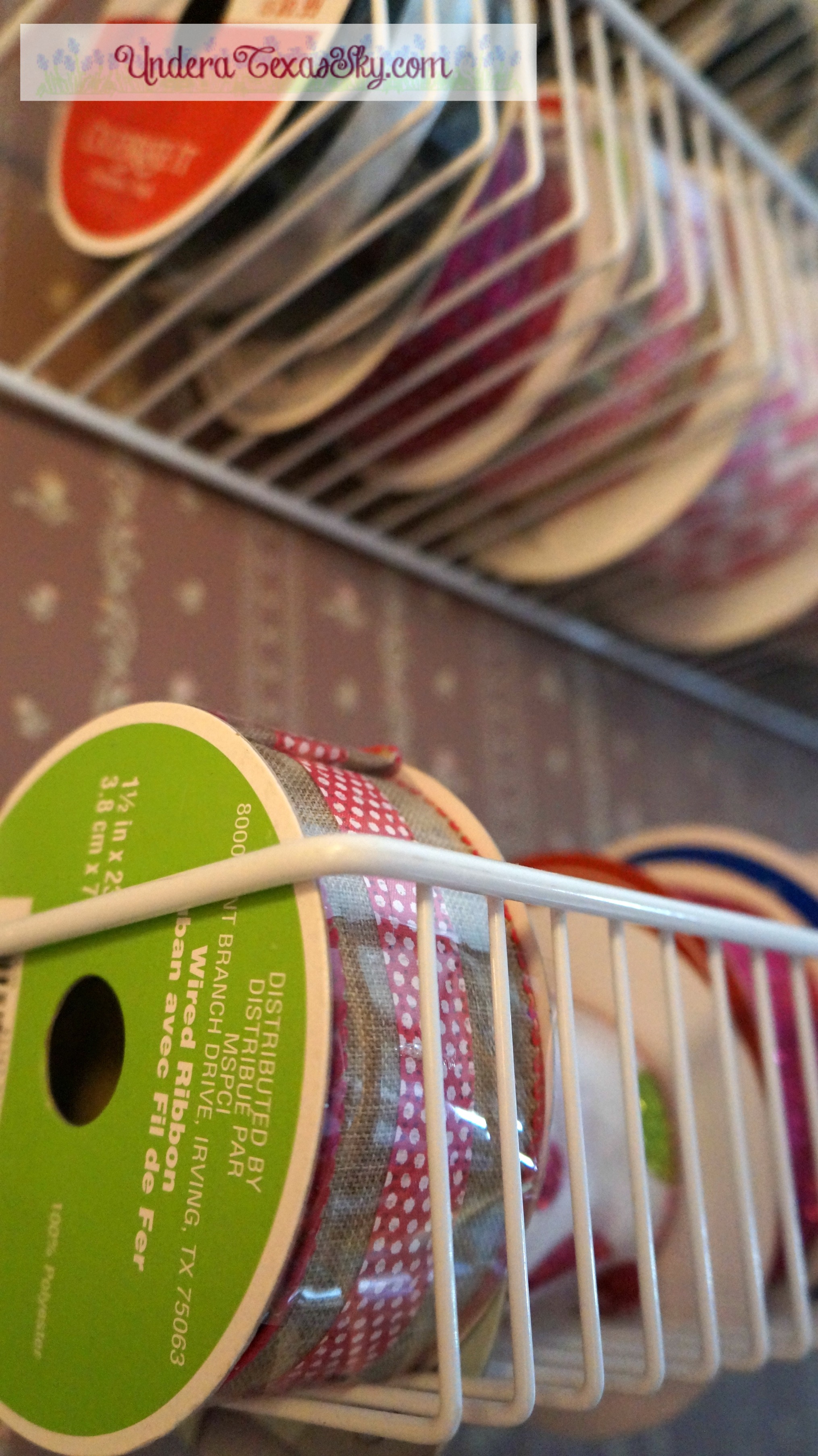 If you’ve spent any time on my blog, you’ve probably seen my post on ribbon storage. We use basic spice racks; the kind you attach to the back of a cabinet door. Six of them will accommodate almost 200 rolls of ribbon (depending on the width). Now if you have rolls that are 25 yard or more, those won’t fit- the circumference is too great. But for your average size ribbon rolls, it’s perfect.