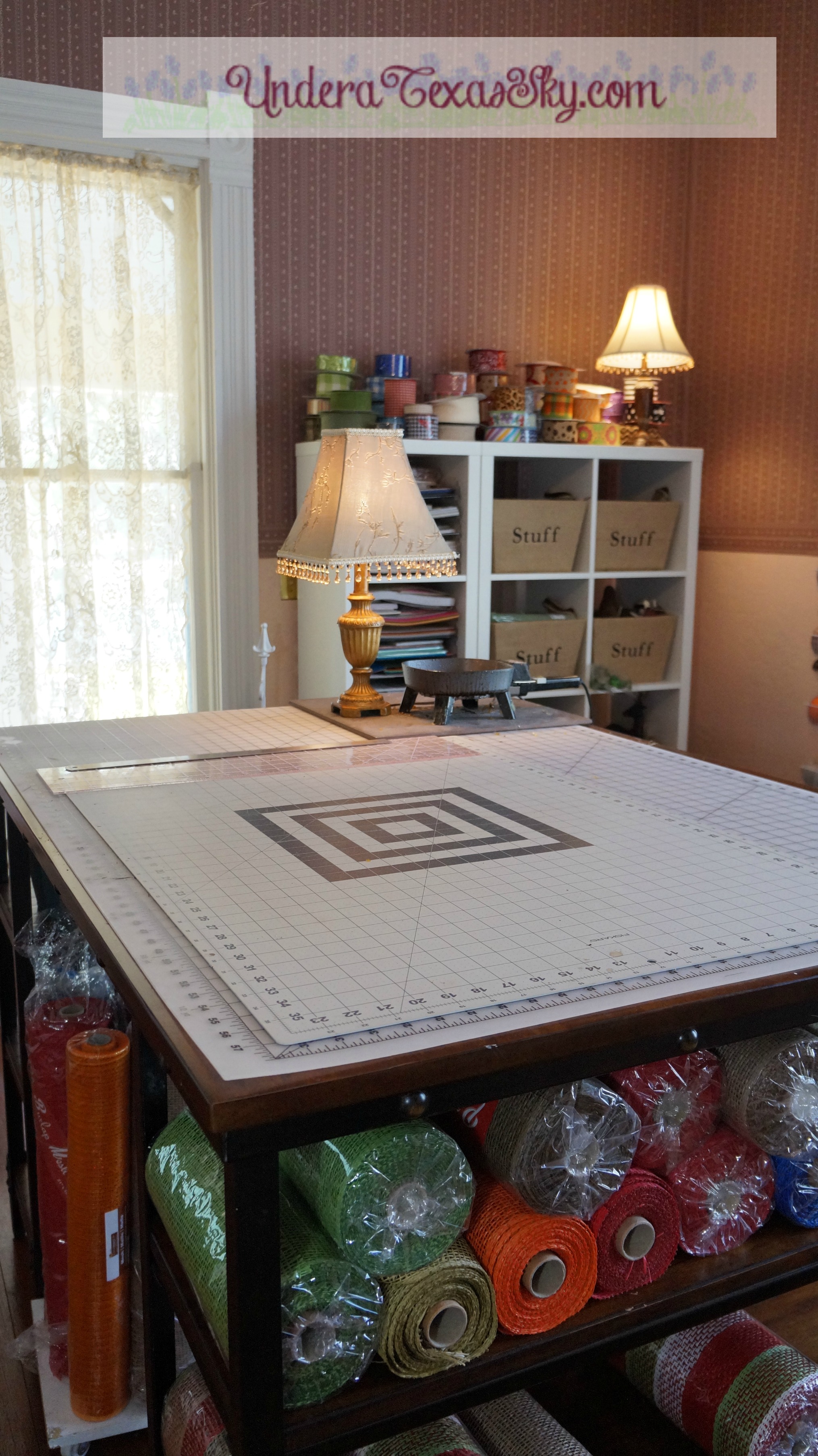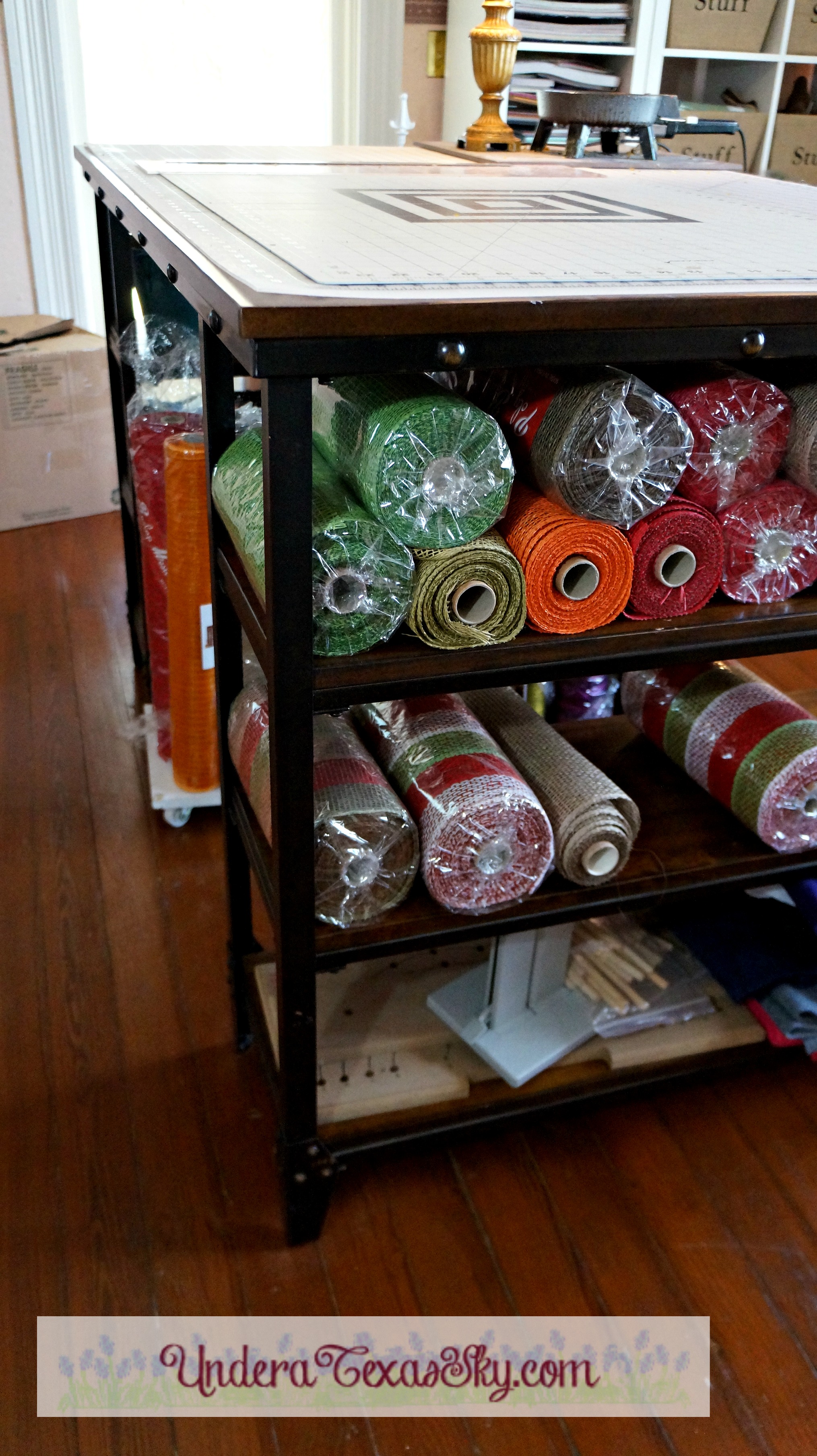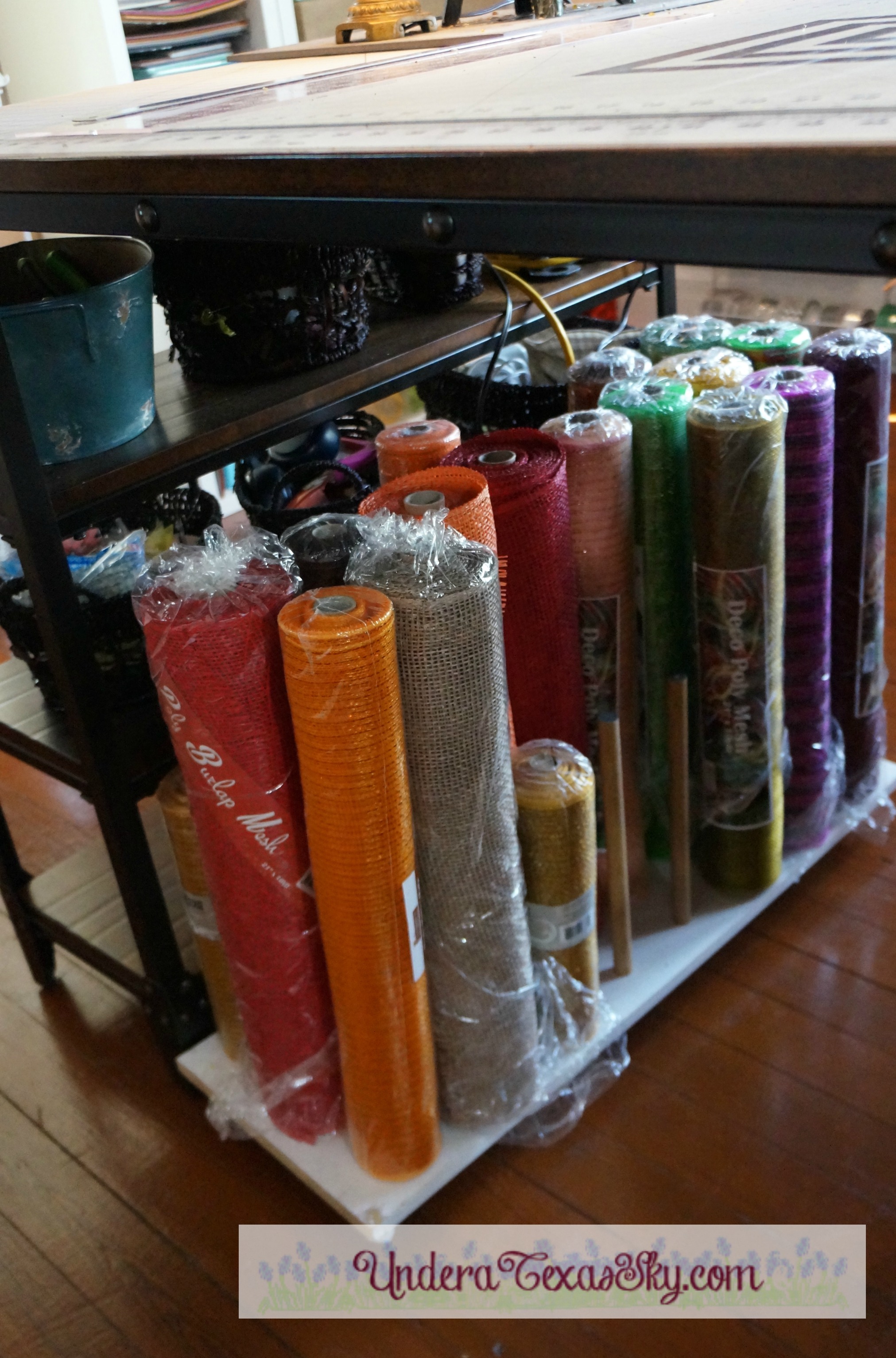 I have a craft table in addition to the side cabinets. Some craft rooms don’t have room for both a table and the cabinets. If there’s a choice between the two, I’d choose the table. Ours is nice because it came with shelves on each end. I think Nebraska Furniture Mart carries this table if you were looking for one like it. If you have a smaller space and need to make your own table to your measurements, you can totally do this also! Our first craft room was a 10×11 bedroom. The shelves of my current table are great for holding baskets. Oh yeah, baskets are cheap storage solutions. I keep my scissors, wire cutters, flower scraps, hot glue pellets, etc. in baskets. Fat rolls of poly burlap mesh also fit nicely on the shelves. The Mean Man made a nice cart to hold my 21″ mesh rolls.