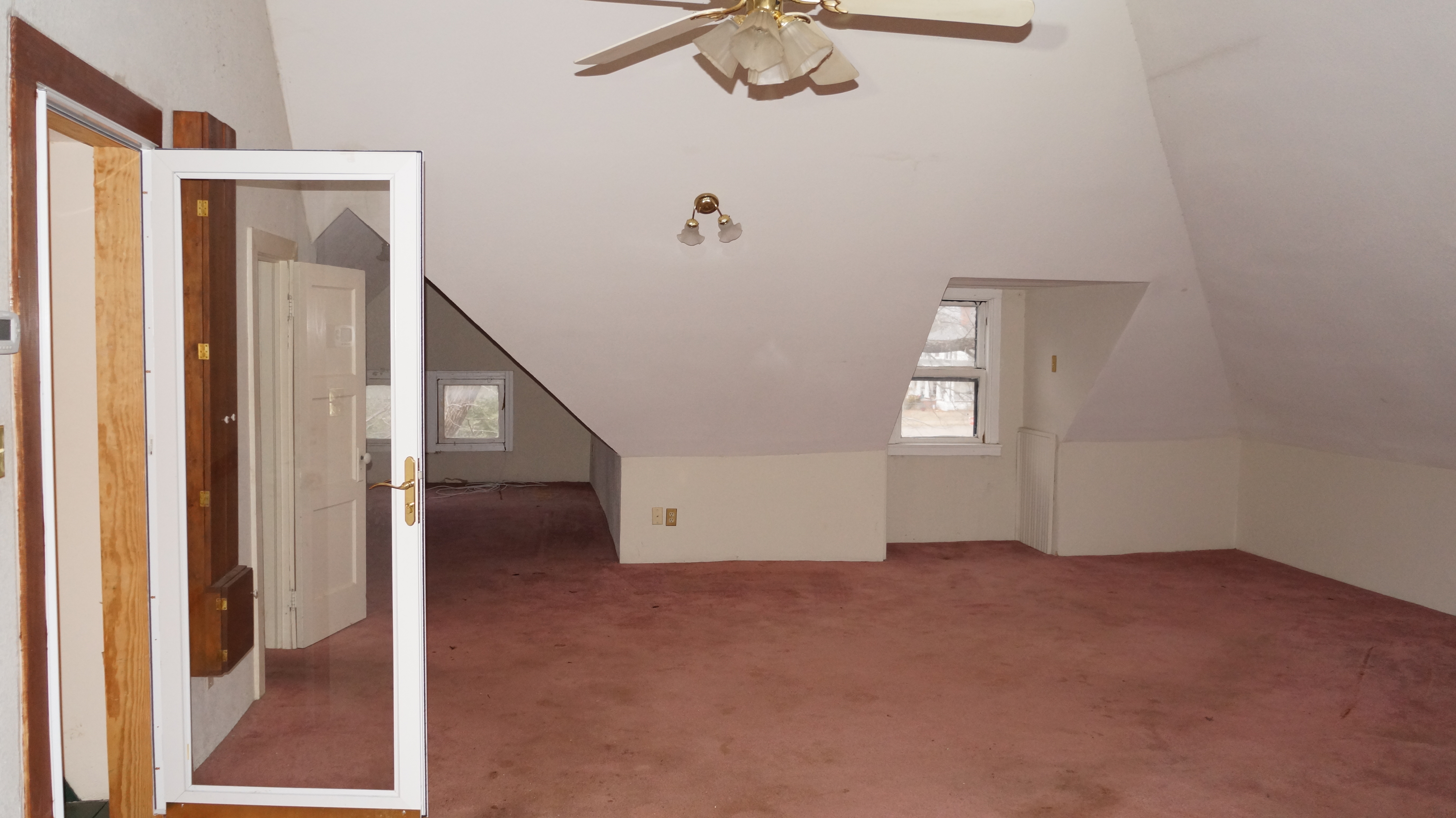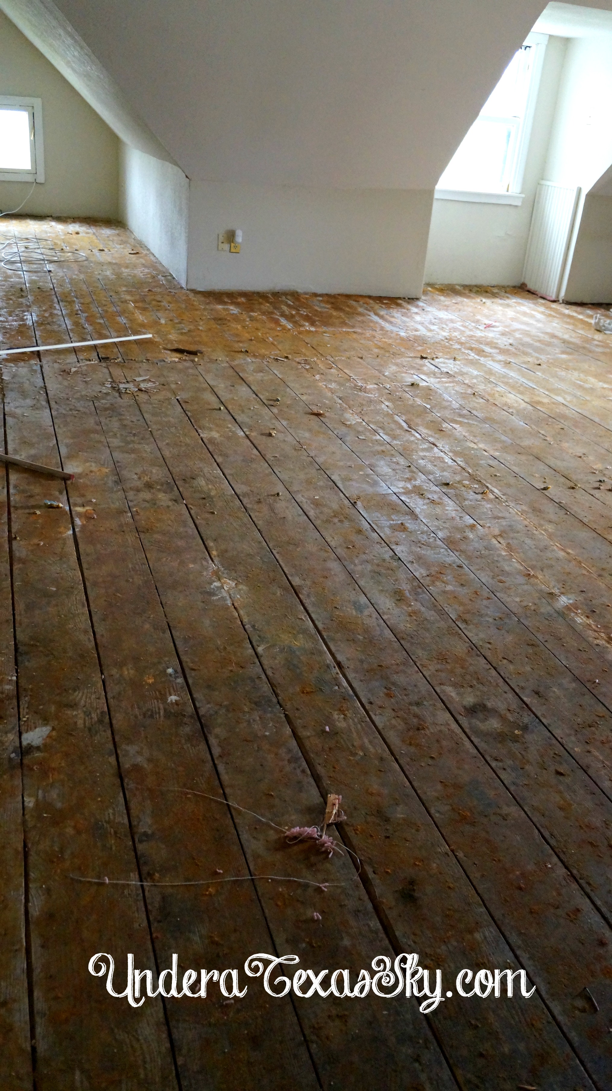 I’ve told you about the third floor carpet and how the former owners had dogs who apparently never went outside. As you might have guessed, that was the first thing to go! The M2 guys jumped right in and got the carpet and pad pulled up and in the dumpster. The smell didn’t diminish immediately, and still not completely, but is definitely better than it was. You can see the floors have a ways to go- but getting it cleared out was imperative.