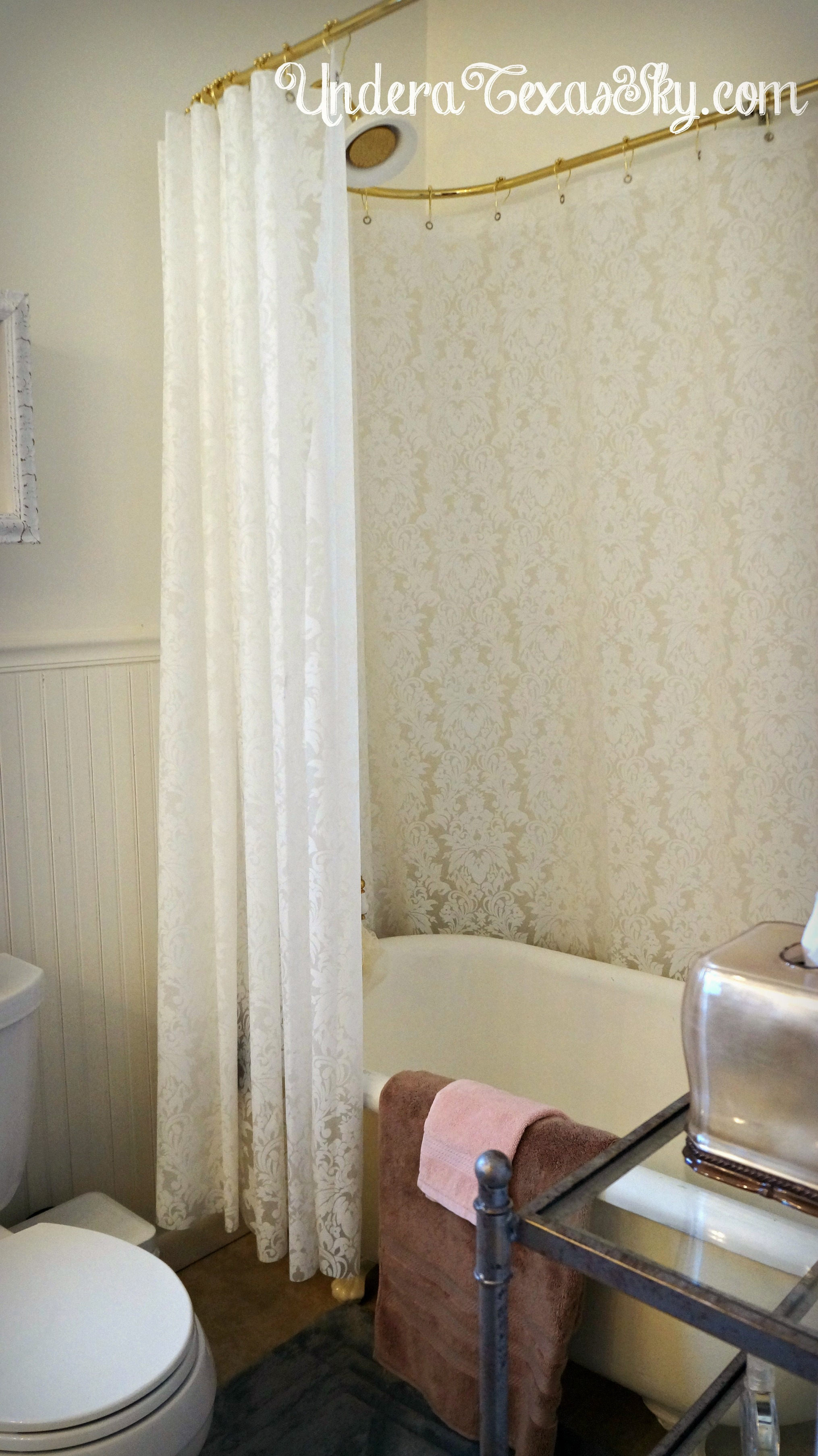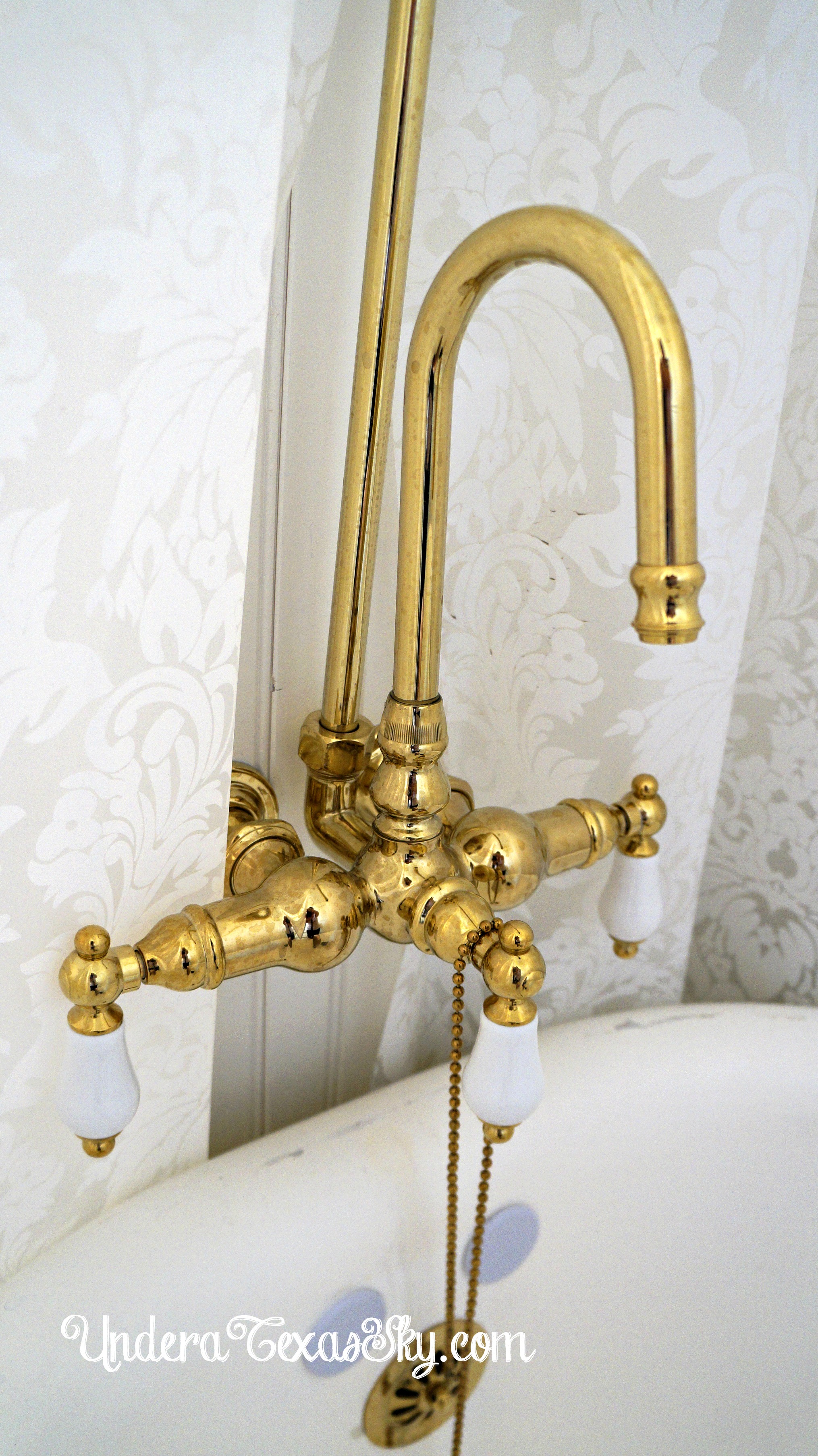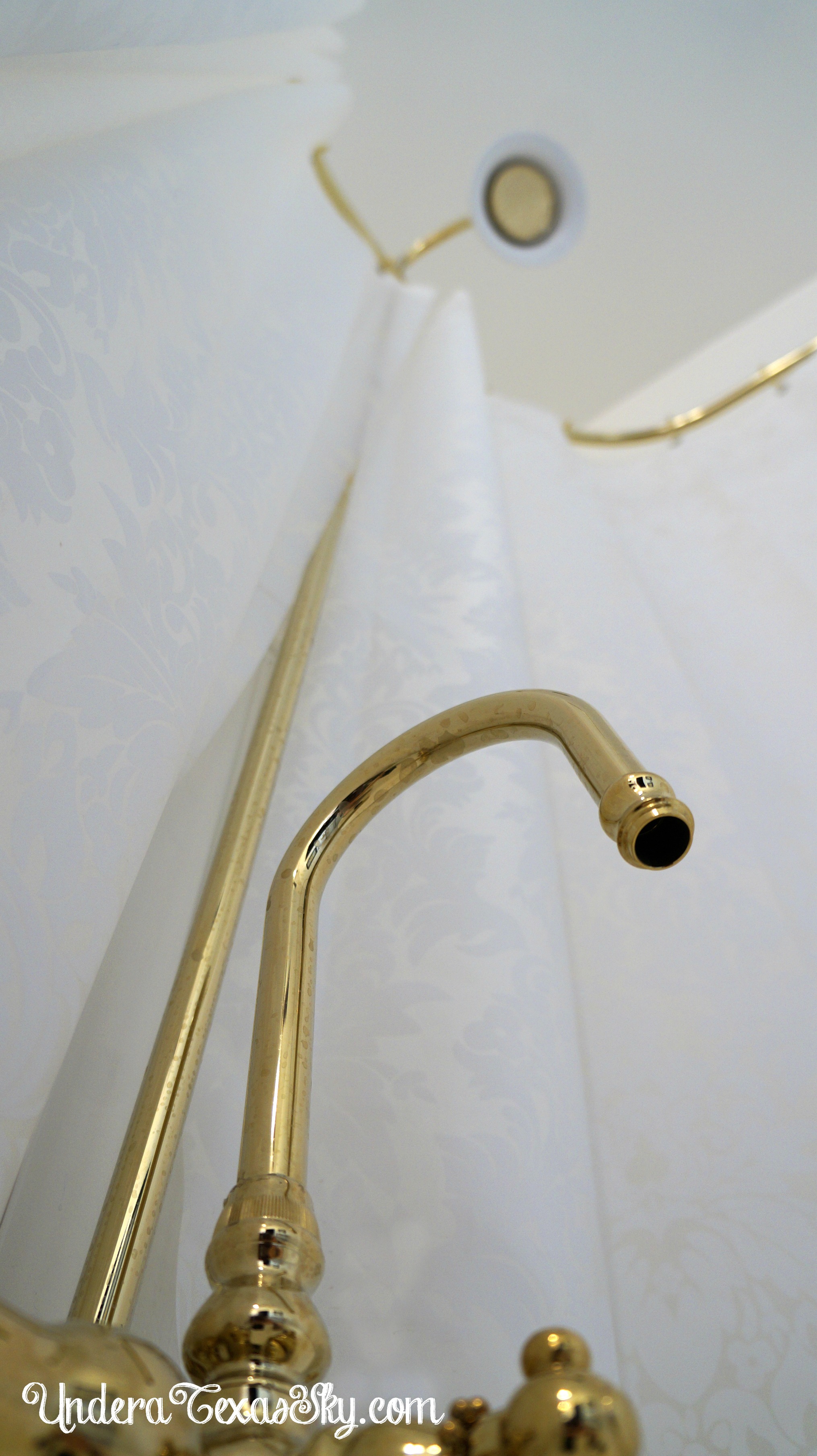 As cheap as the sink faucets were, the tub faucet was equally expensive. Wow, I couldn’t believe how much a brass clawfoot tub faucet with shower diverter could be. Let’s just say it was close to $1,000 after tax. I almost choked, but it was a must have. It did come with the faucet, shower diverter, rain shower head, and the oval shower curtain rod. We attached the faucet through the wall, because there is a huge concrete cistern underneath the floor of the bathroom that made moving the plumbing impossible.