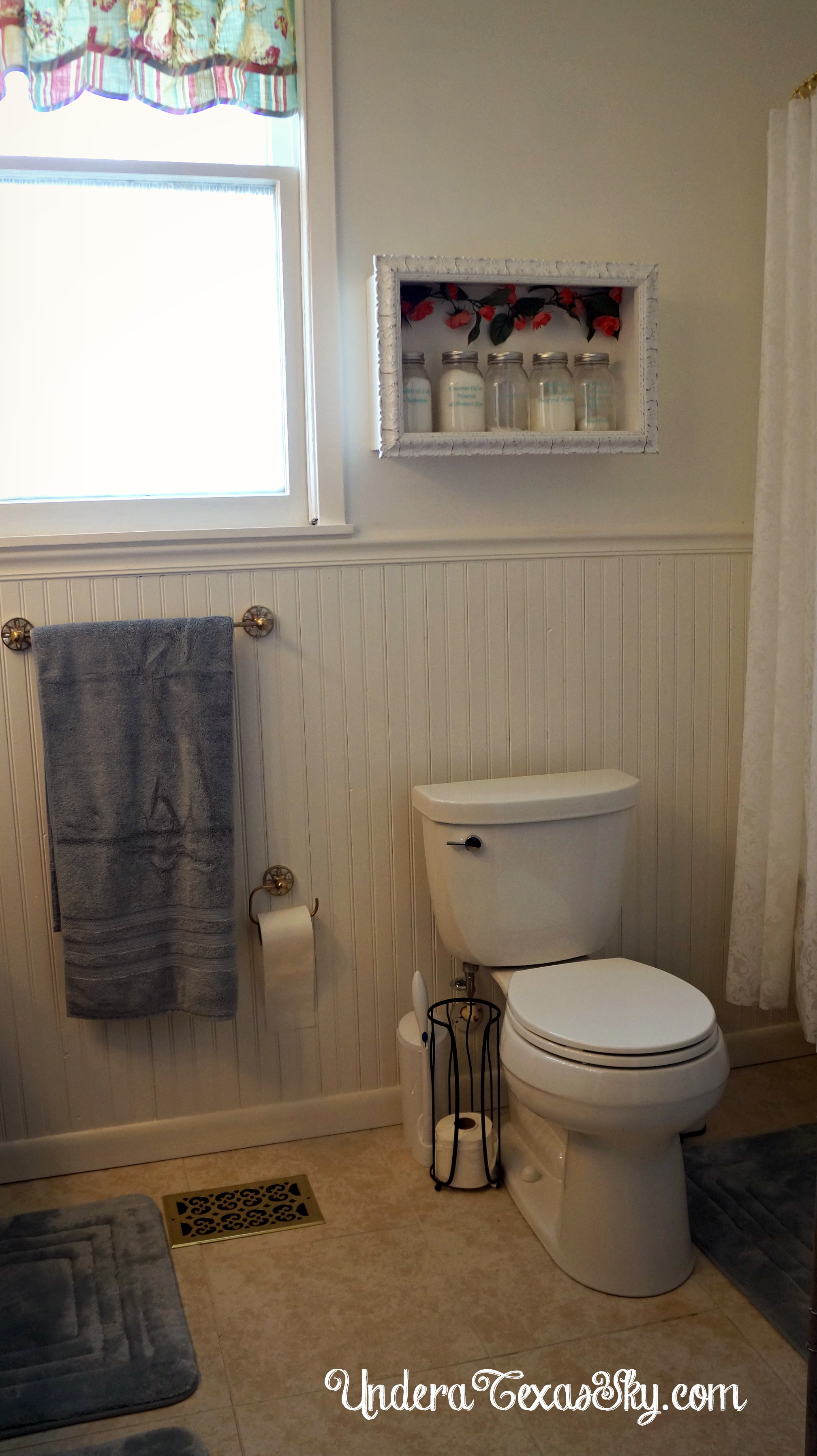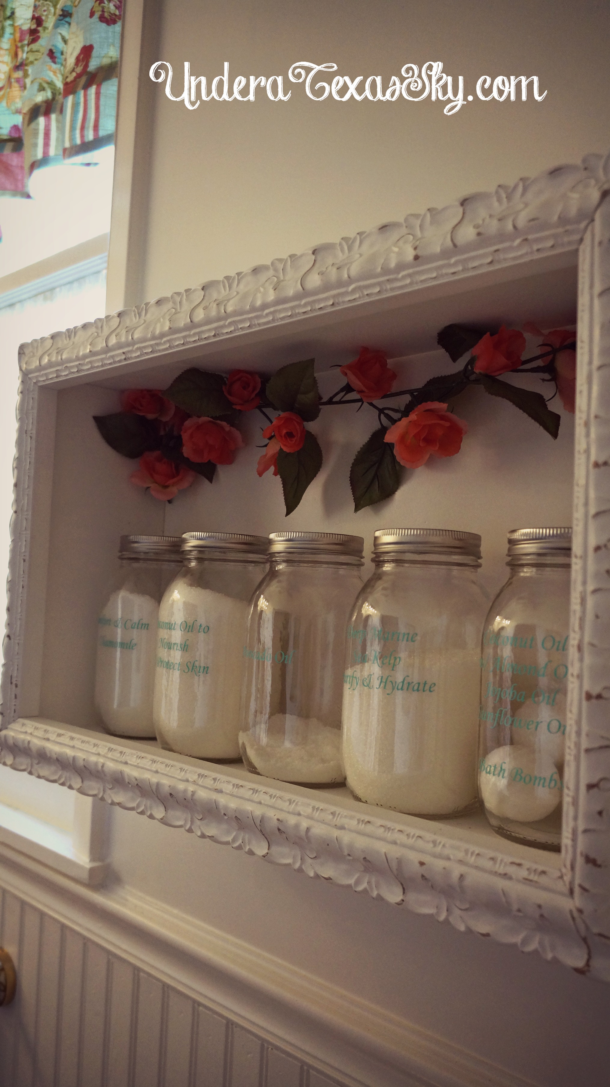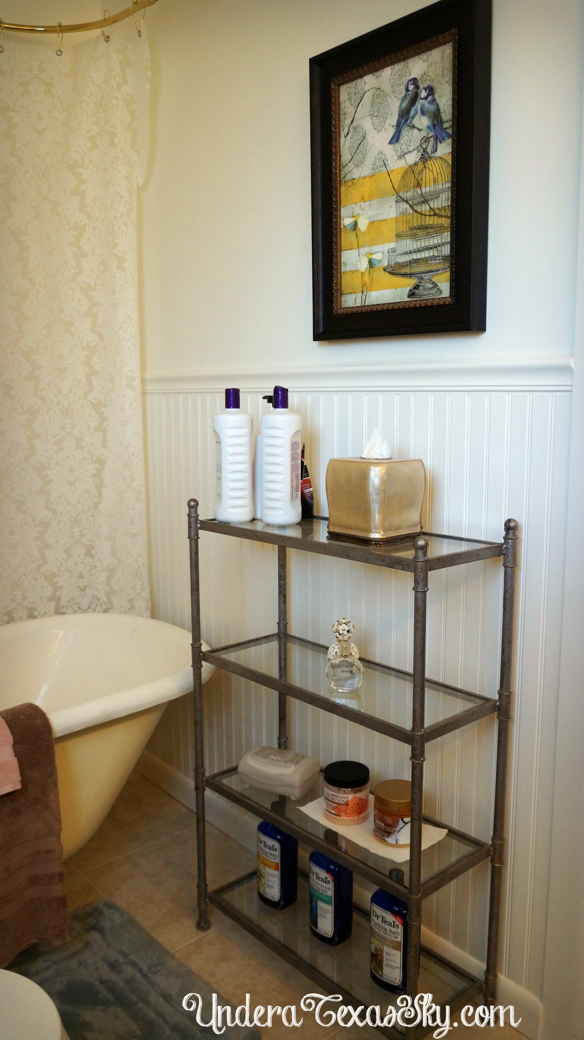 Having a place to store and access your shower essentials like shampoo, conditioner, face wash, etc. is a bit of a problem if you have a clawfoot tub. I looked all over Pinterest to see what other people use. Most of the time, people just use a small table next to the tub. The small table worked for me for a few weeks, but my hand would drip all over the table top and it was wood, so I knew this wouldn’t work for the long term. We finally picked up a little three tiered metal and glass shelf to set next to the tub. It works really well. It’s impossible to keep completely dry, but because the shelves are tall, gravity keeps my hands from dripping too much. And the fact that the shelves are glass and metal, a little water won’t hurt. A wood shadow box from HL works great to store my bath salts. I put them in cute Mason jars.