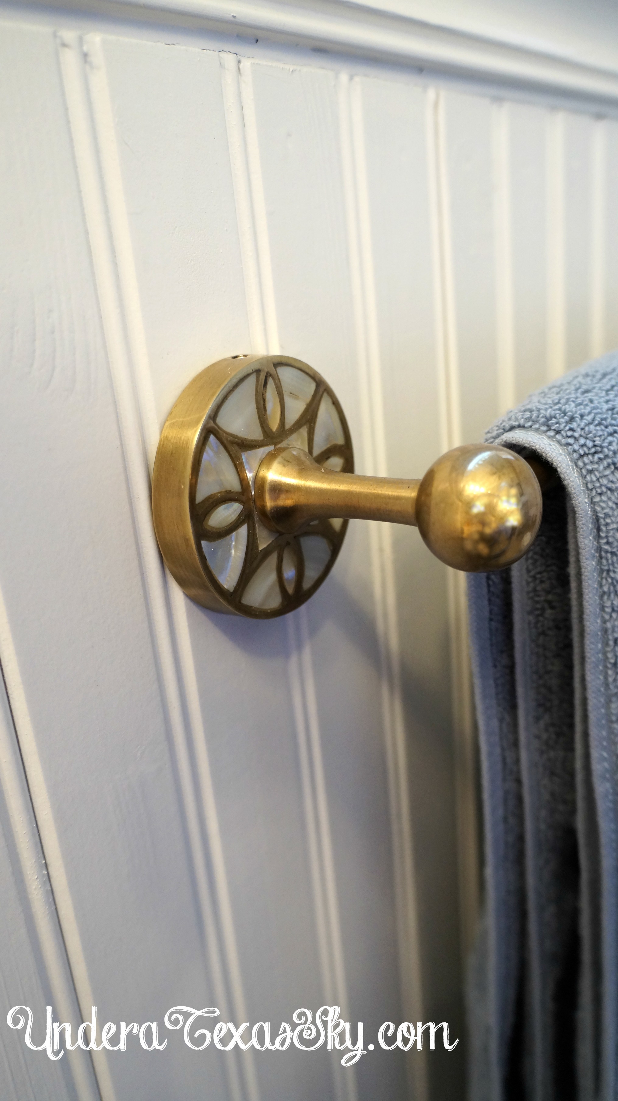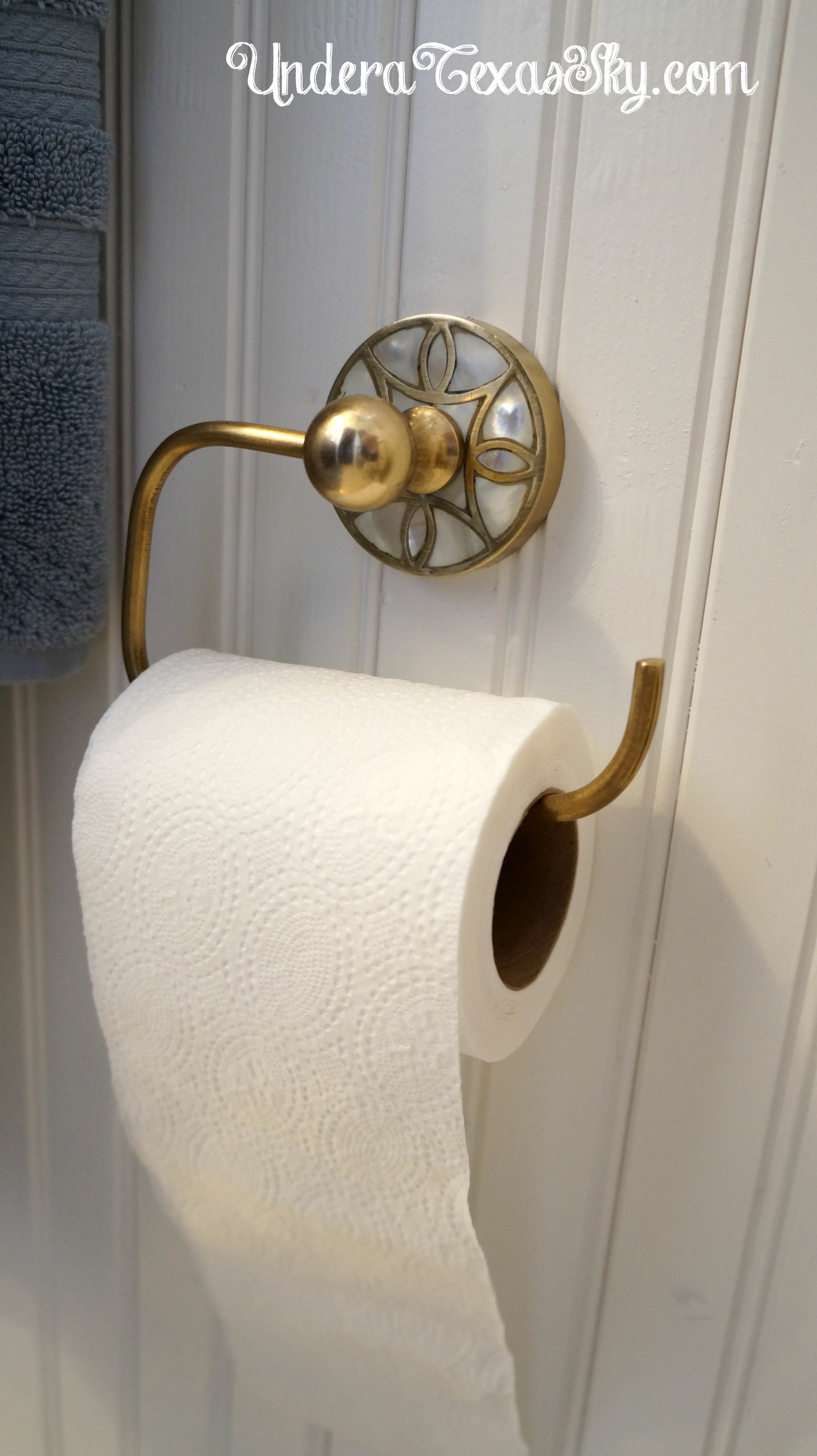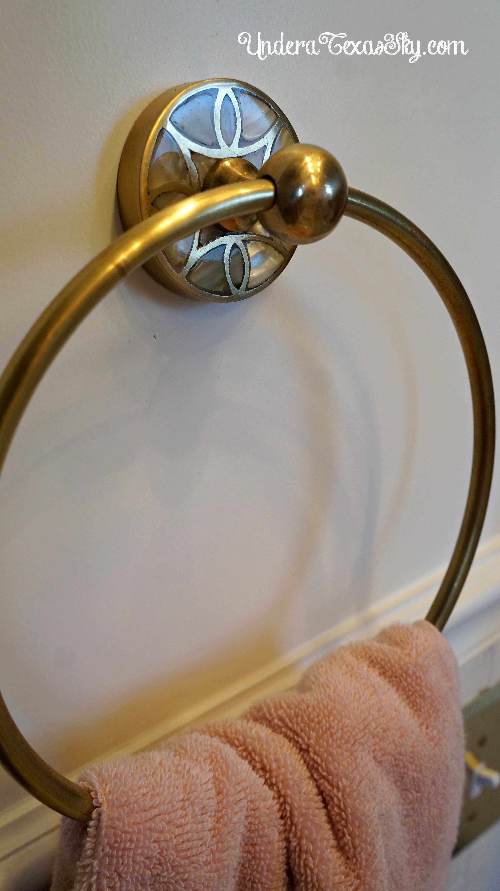 Brass towel bars were much easier to come by. Not as prolific as brushed or satin nickel, or ORB, but still. The thing is, almost everything looks just the same to me. Marty had his eye out on one of our visits to Hobby Lobby, and lo and behold, they actually had a towel bar, toilet paper holder, and hand towel ring in brass. But theirs also had an added bit of flair. We snatched them up.