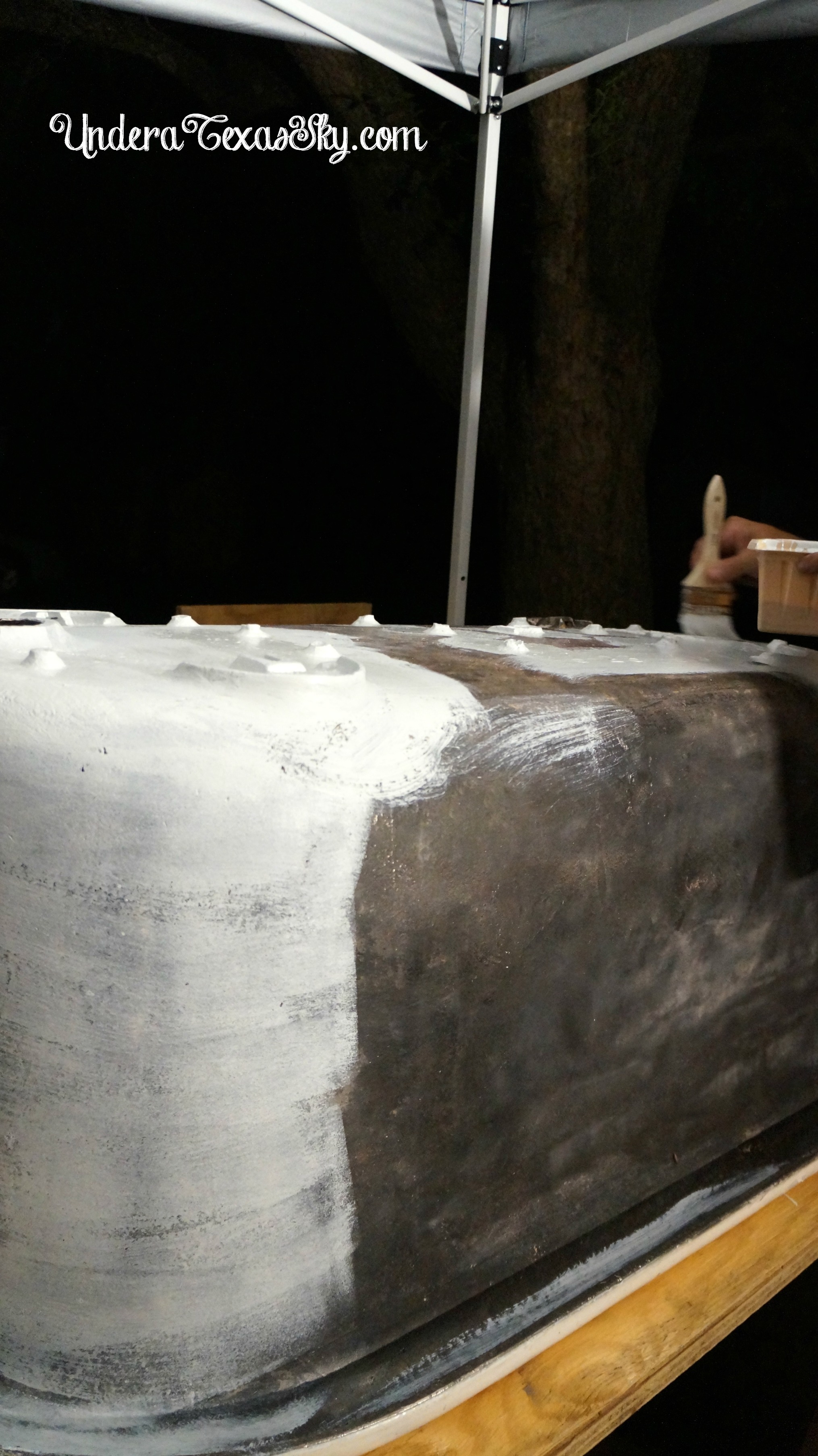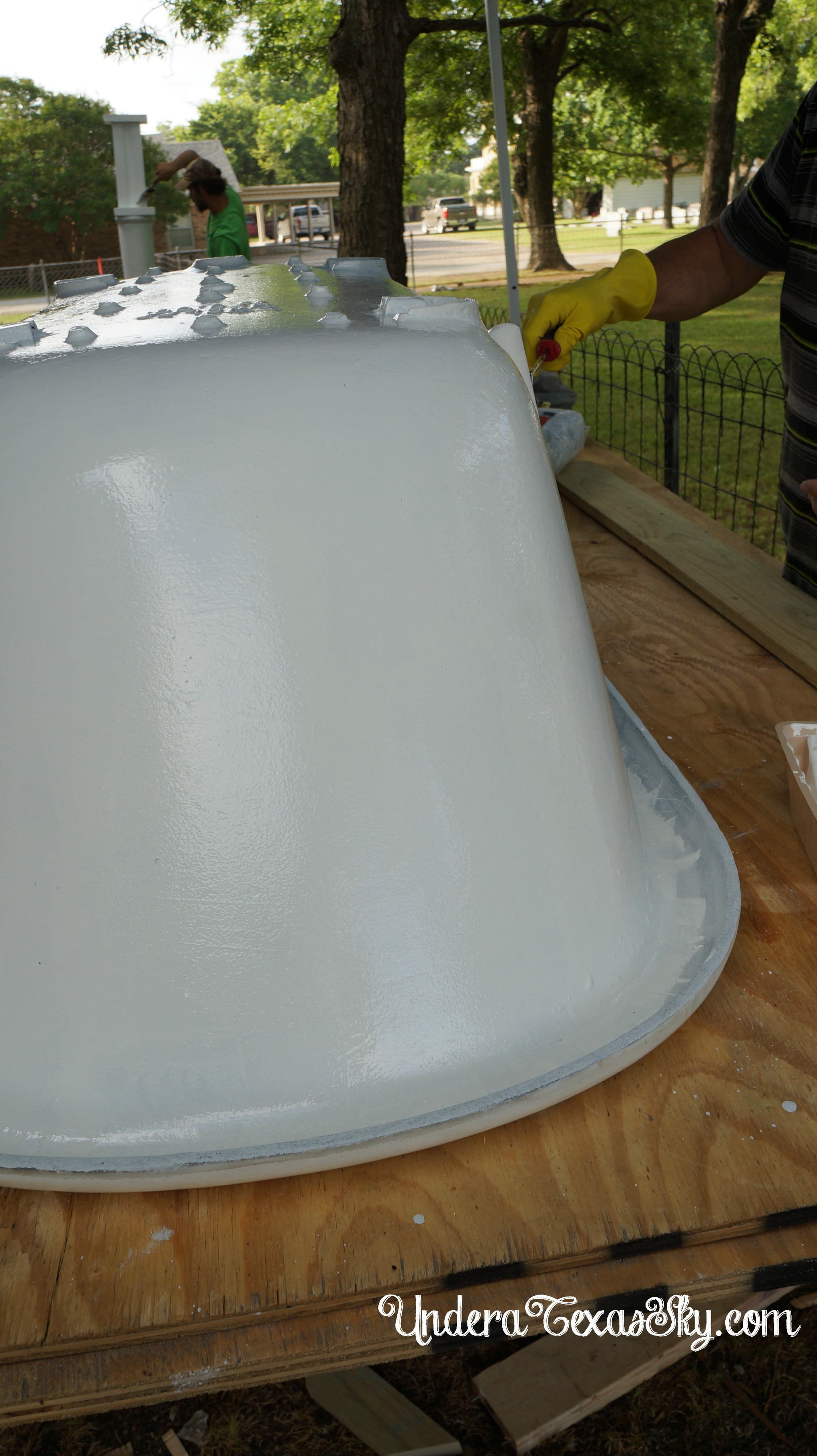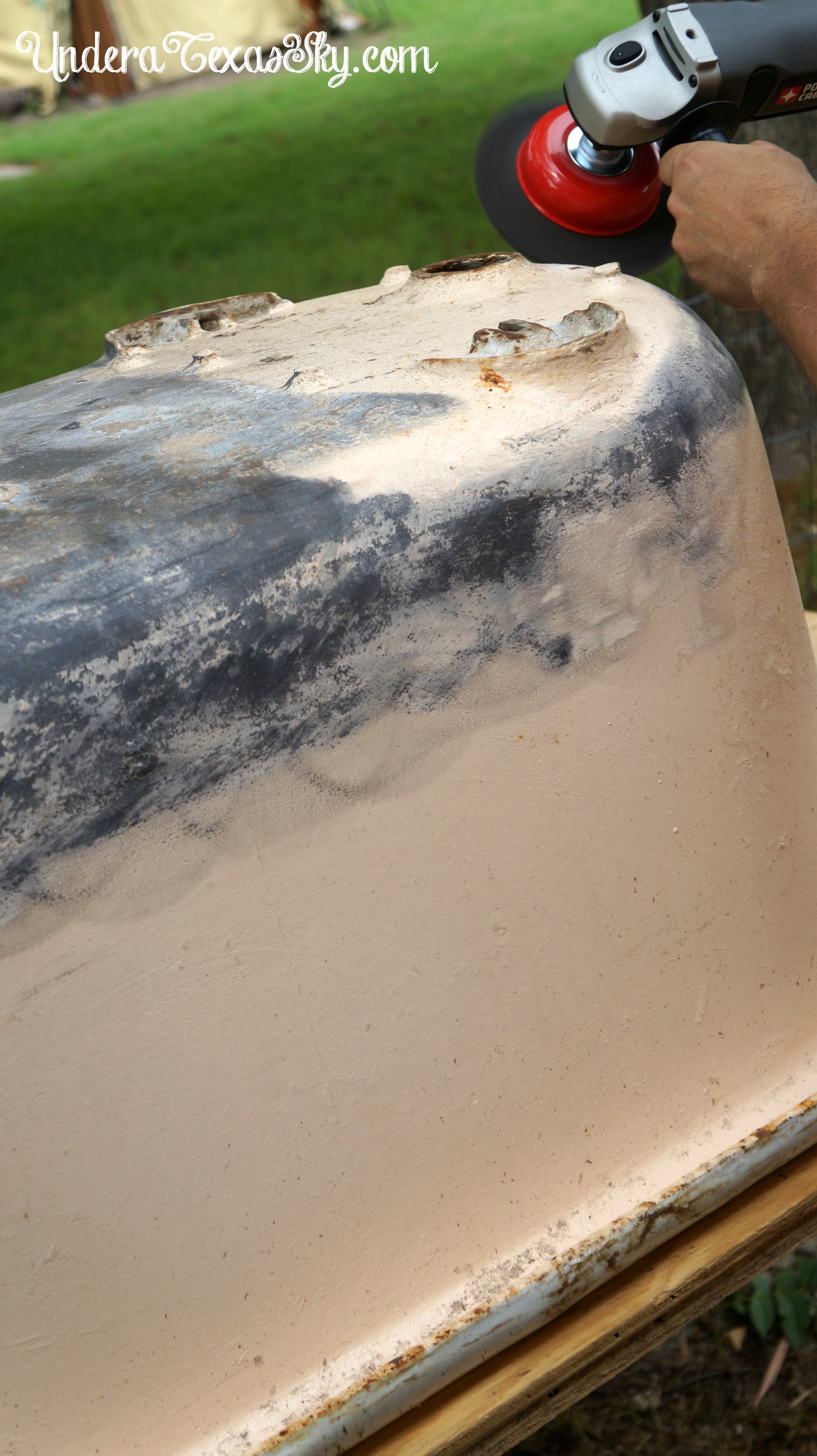 I fully intend to create a post showing how we did this. But we only did the outside of the tub. The inside, while not perfect, is fine for now and I just couldn’t insist that The Mean Man take on yet another task. So here’s are a few pics (without commentary) of him refinishing the tub’s exterior.