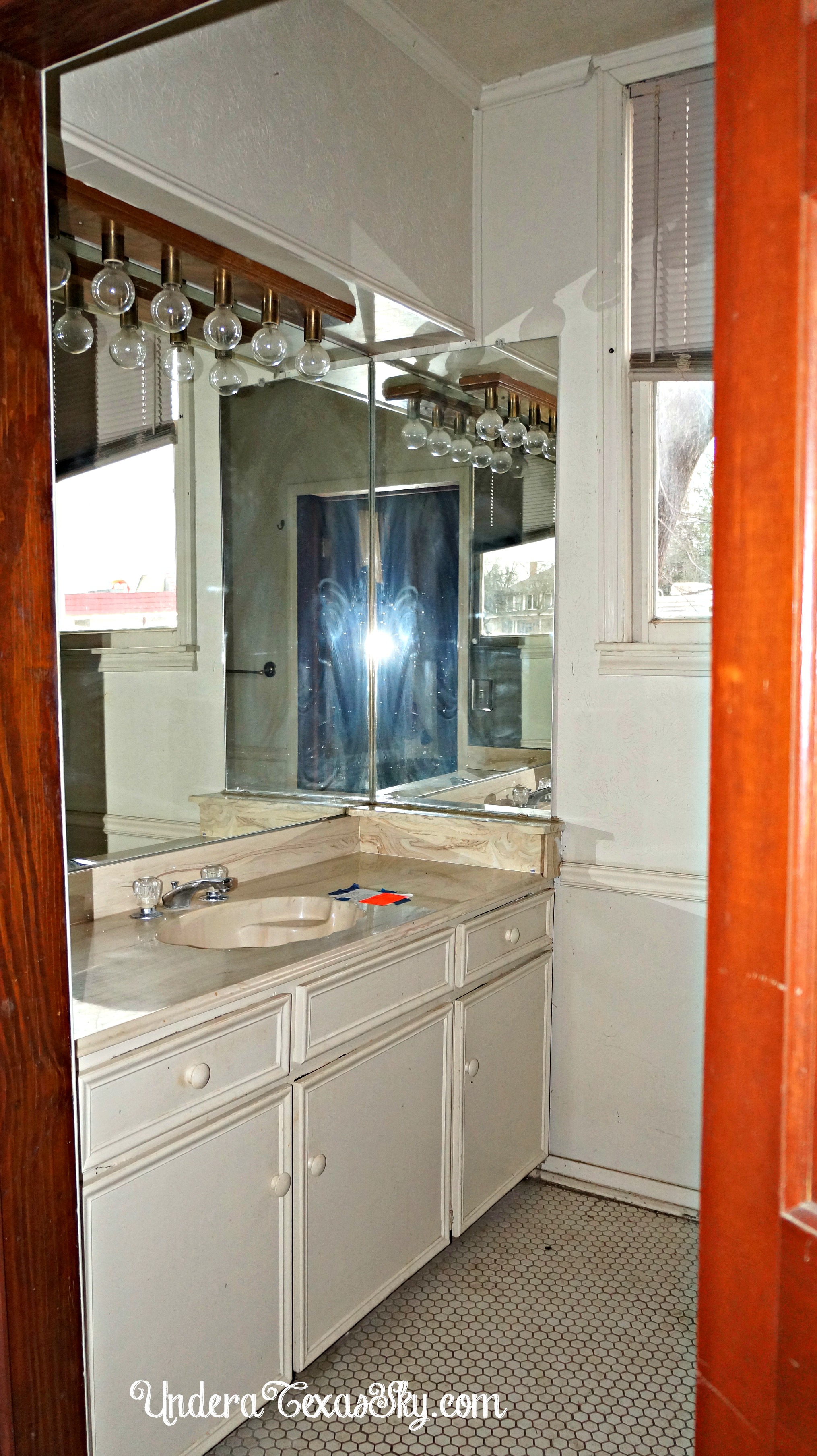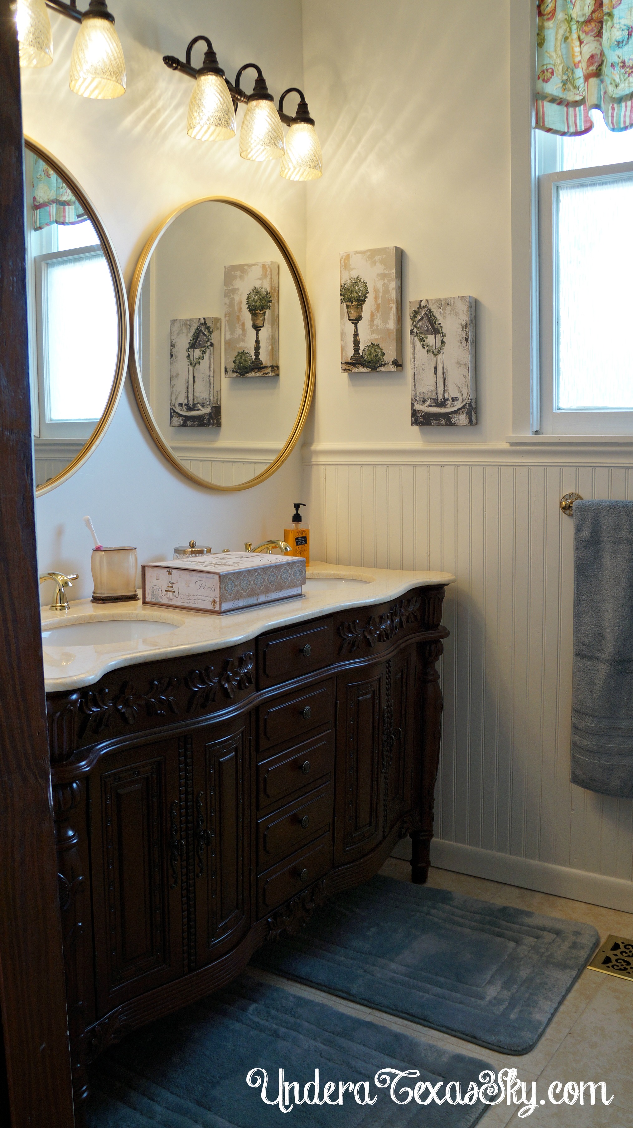 The vanity came with an attached marble top with sinks so all we had to add were the faucets. In keeping with the overall design, we chose brass fixtures. Honestly, the faucets for the sink were about the cheapest the home improvement store carried. It was the ONLY brass faucet they had. I like the simplicity. A brass light fixture could not be found, so we went with two oil rubbed bronze light bars. These bars came without globes, so you can customize them the way you’d like. We chose decorative glass globes with gold flecks throughout.