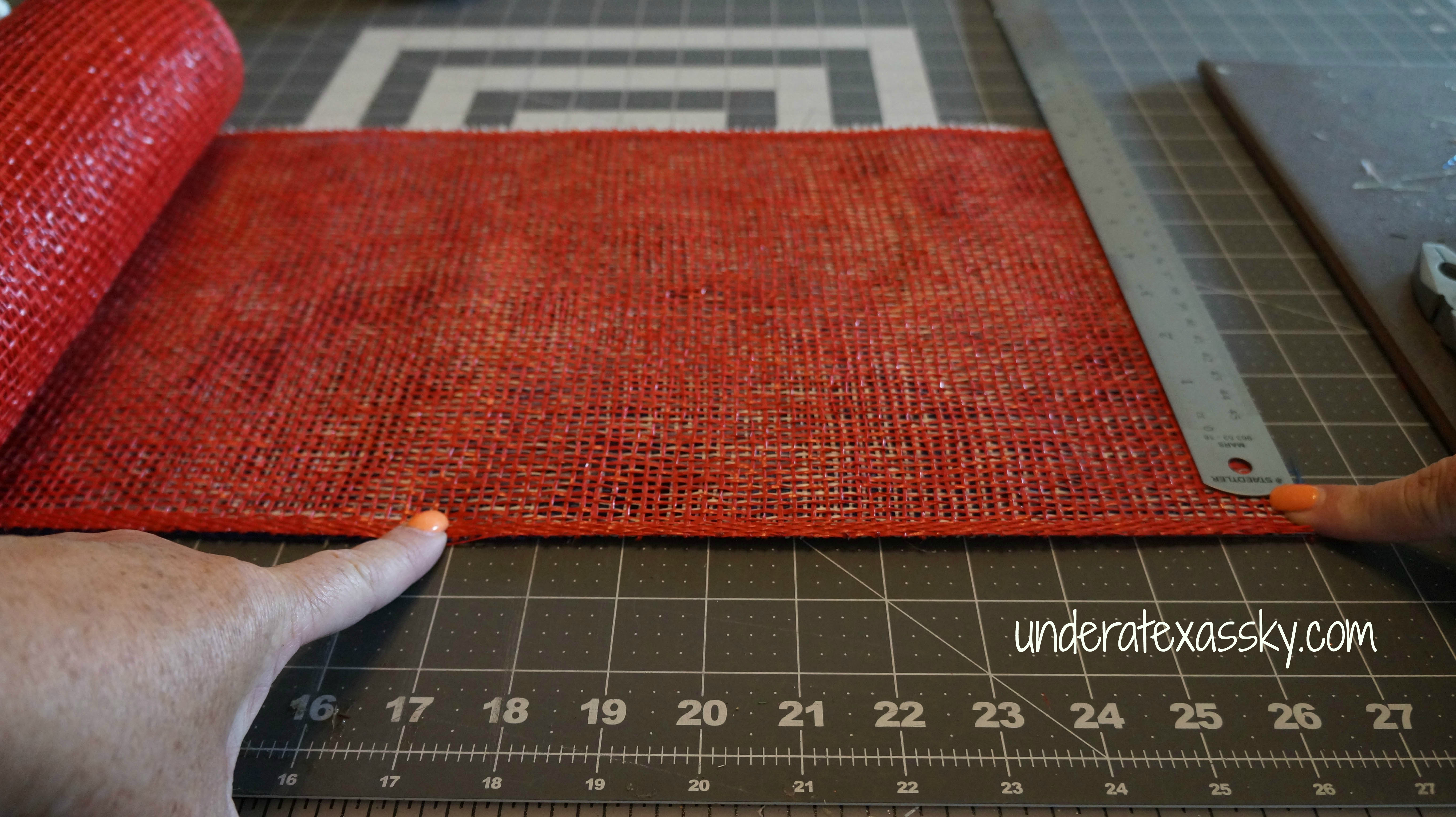You’ll cut the mesh every 10.” This will create 10″ squares since the mesh is 10″ wide. There are 18 twists on a work wreath. If you fill each twist with two ruffles, that’s 36. If you triple up your rolls, you’ll need to make 13 cuts (13 x 3 = 36). You can add more ruffles to each twist if you want it more full- but two work just fine.