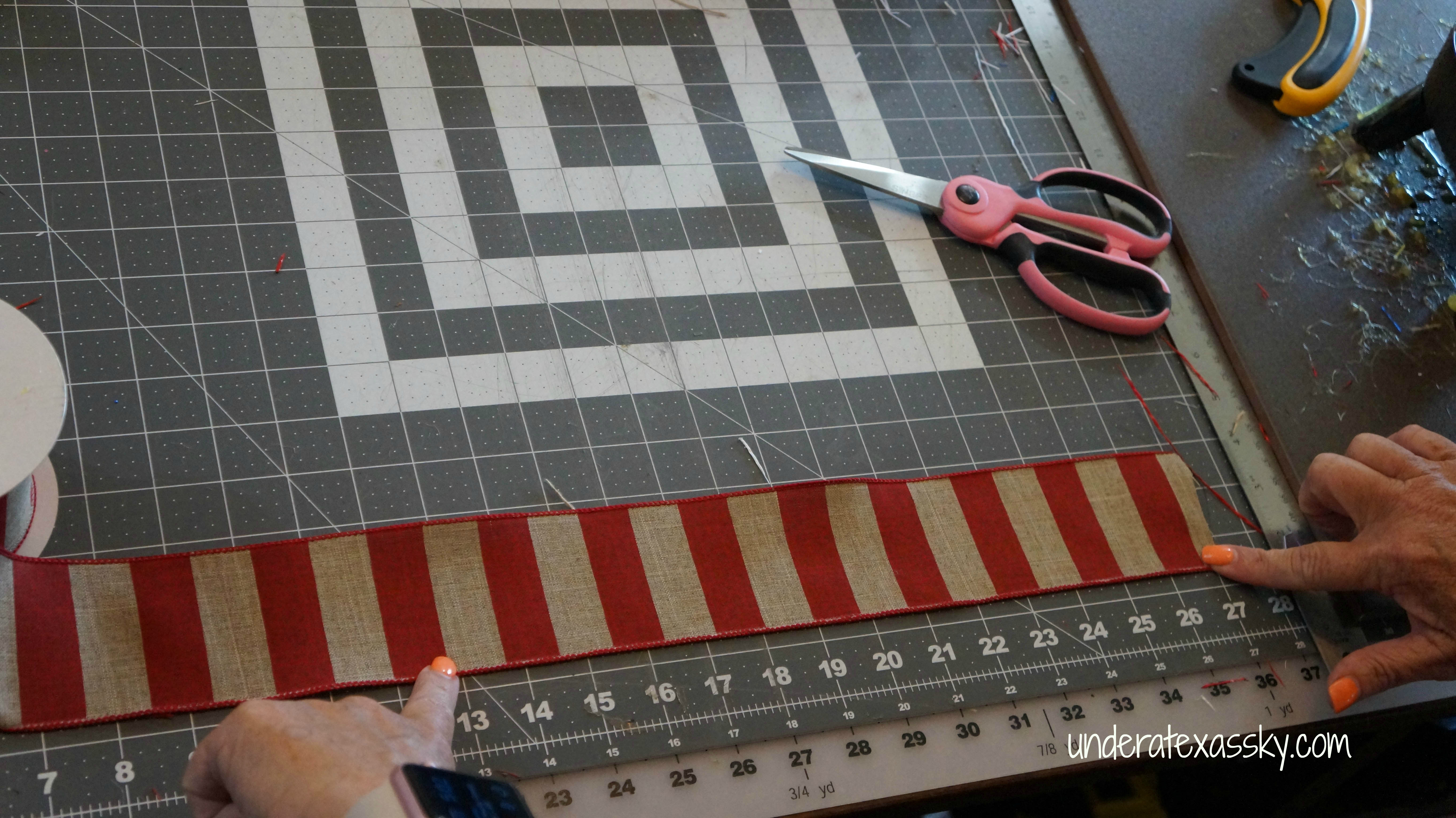 Next it’s time to add the ribbons. I used two rolls of 2 1/2″ ribbon. I cut my ribbon into just about 15″ lengths. This is a lot of ribbon- but makes a gorgeous wreath!