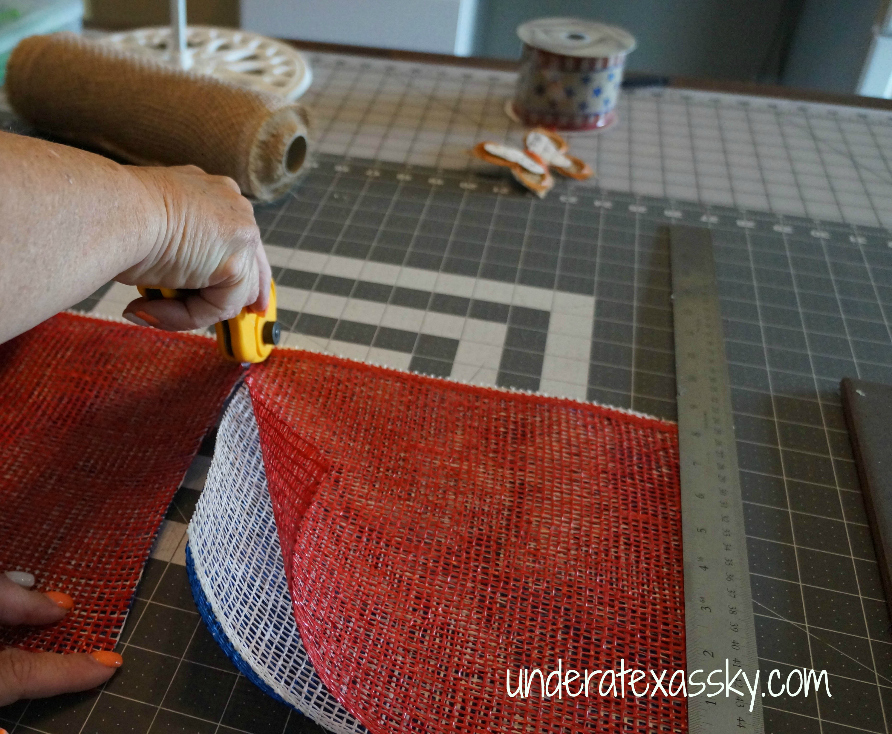 I love this ruffle style mesh wreath made with red, white and blue poly burlap mesh. I also threw in some burlap mesh as well. This is an easy to follow wreath tutorial that’s sure to make you want to try it. Here are the materials you’ll need to create this beautiful wreath: