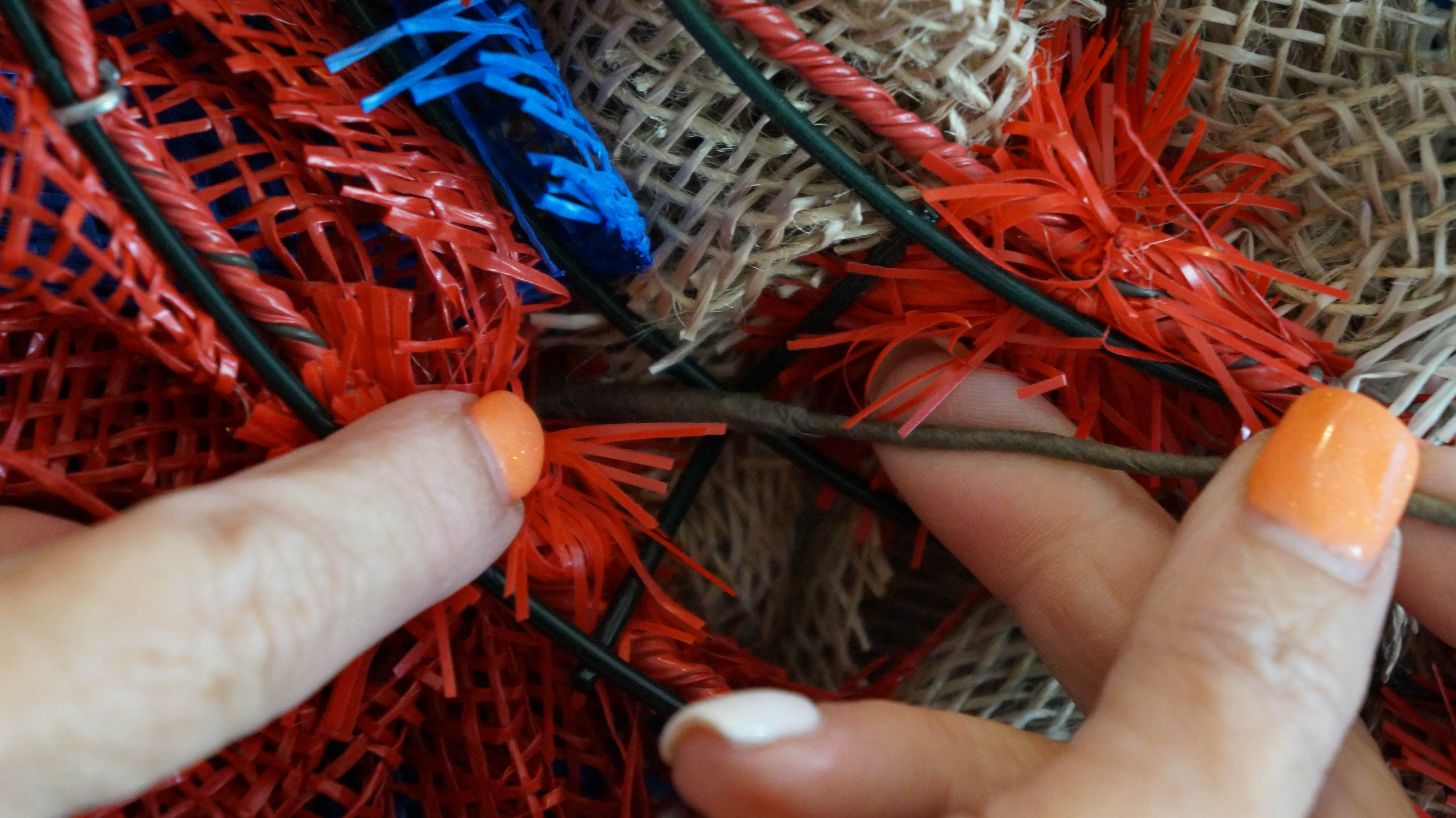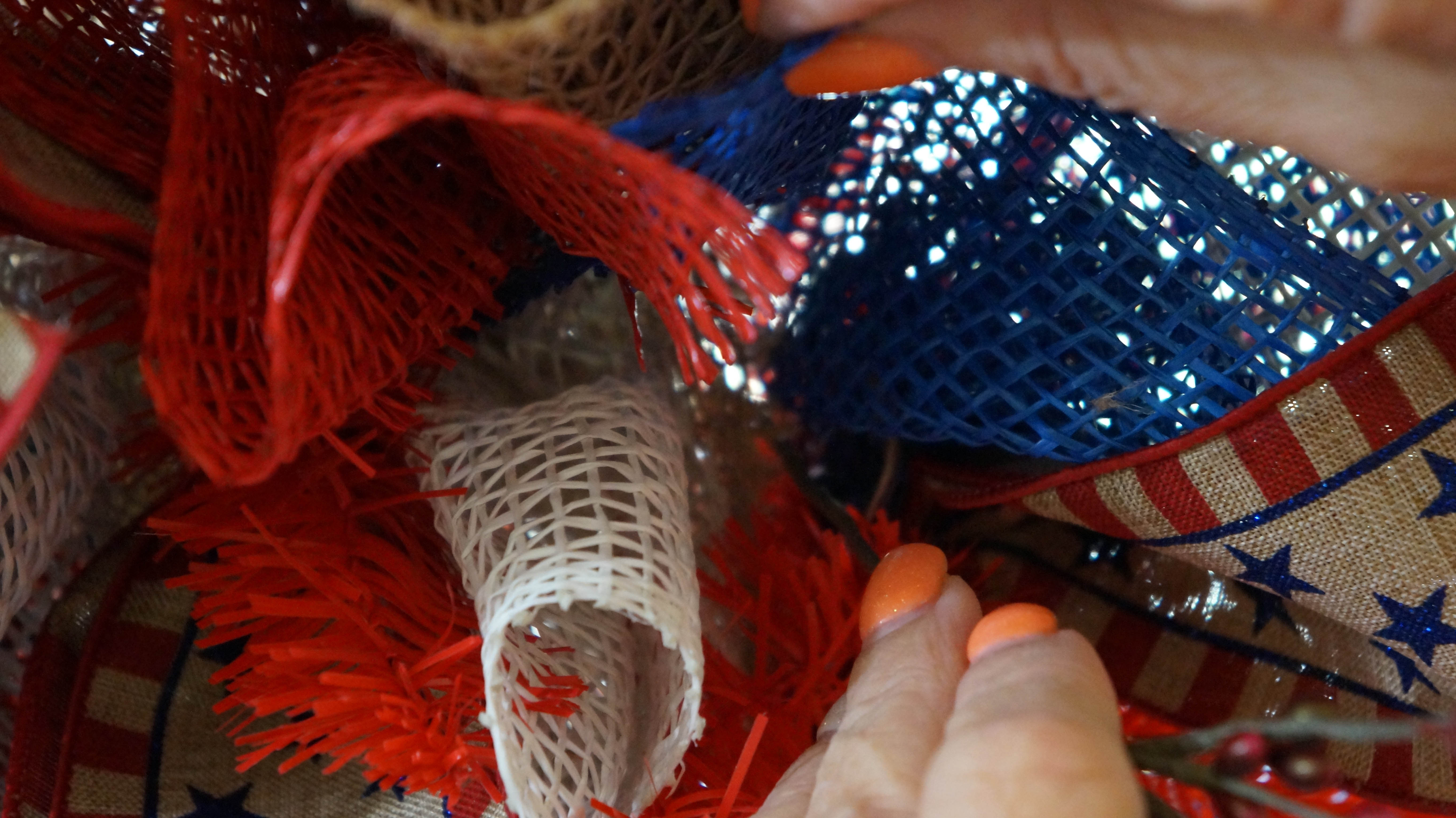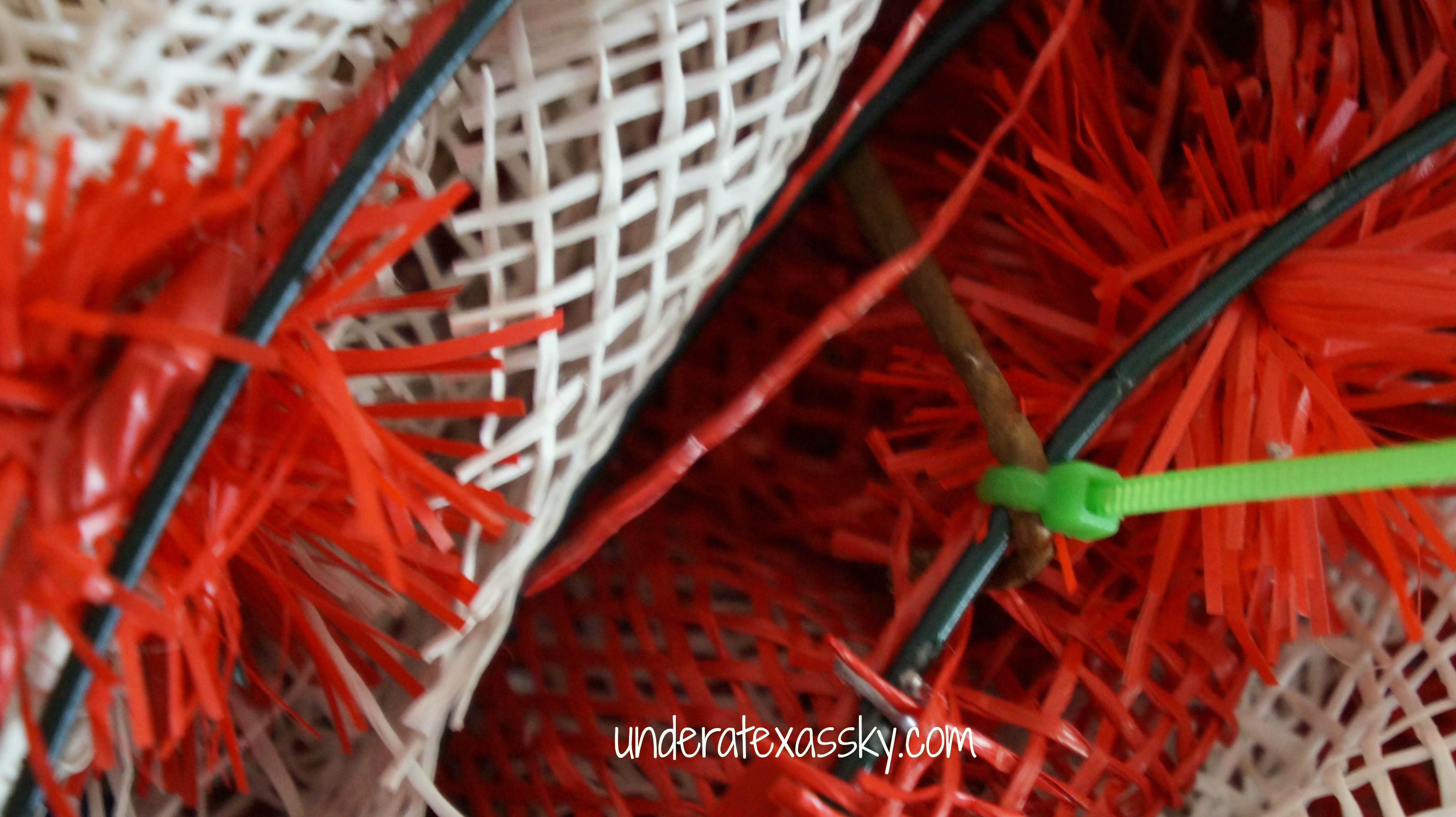 I stuck some wire picks with little red white and blue beads into the wreath and secured them on the back of the wreath by twisting the wire of the pick around the wreath form, then using a zip tie to secure it.