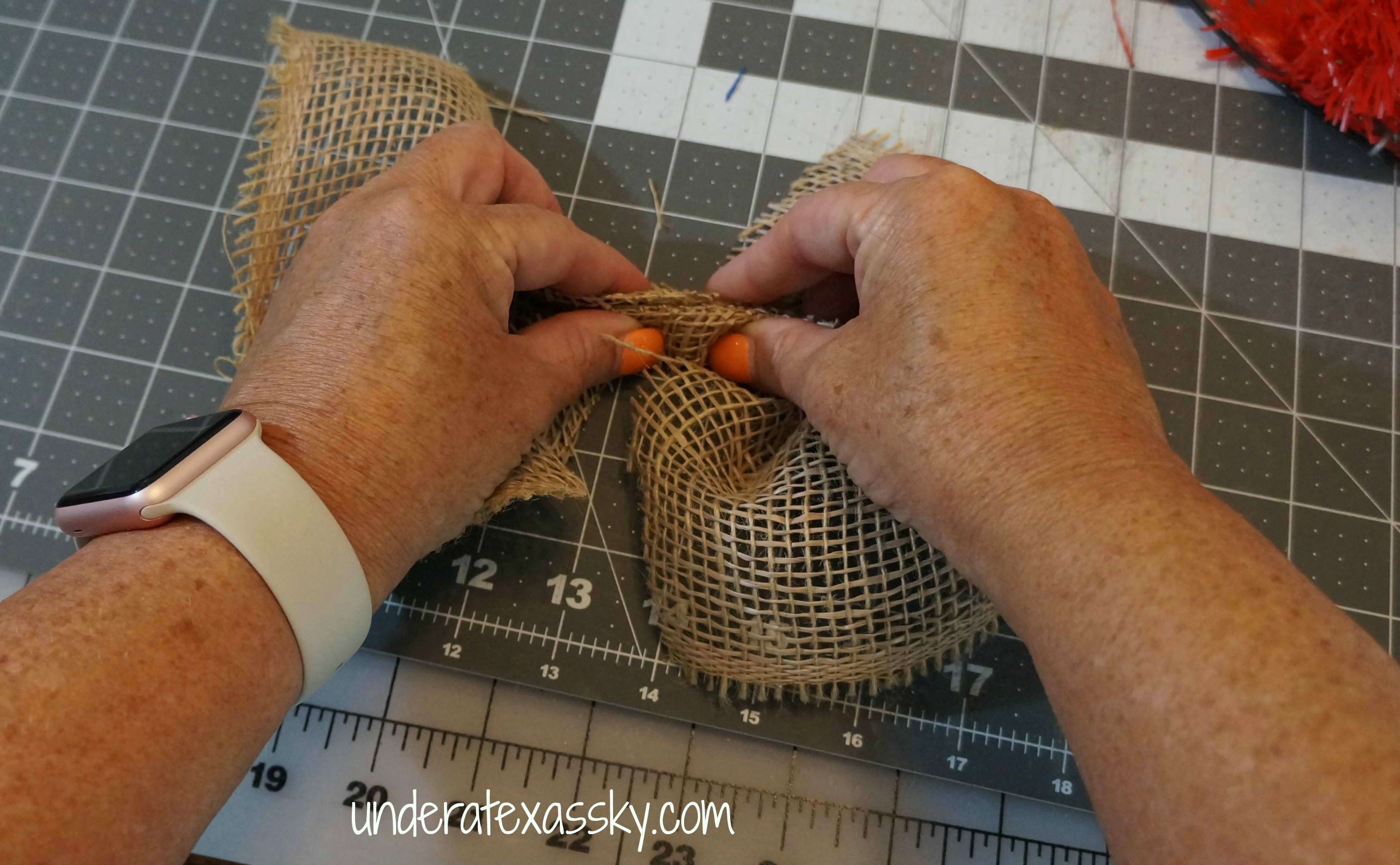 I cut enough ribbons for each twist to have two ribbons. I used both ribbon styles for each twist (stars & stripes, and red and burlap striped). Squeeze your length of ribbon in the middle and add it to the twist. Add both ribbons to each twist and then separate them once your twisted them in. Go ahead and give two good twists to secure them.