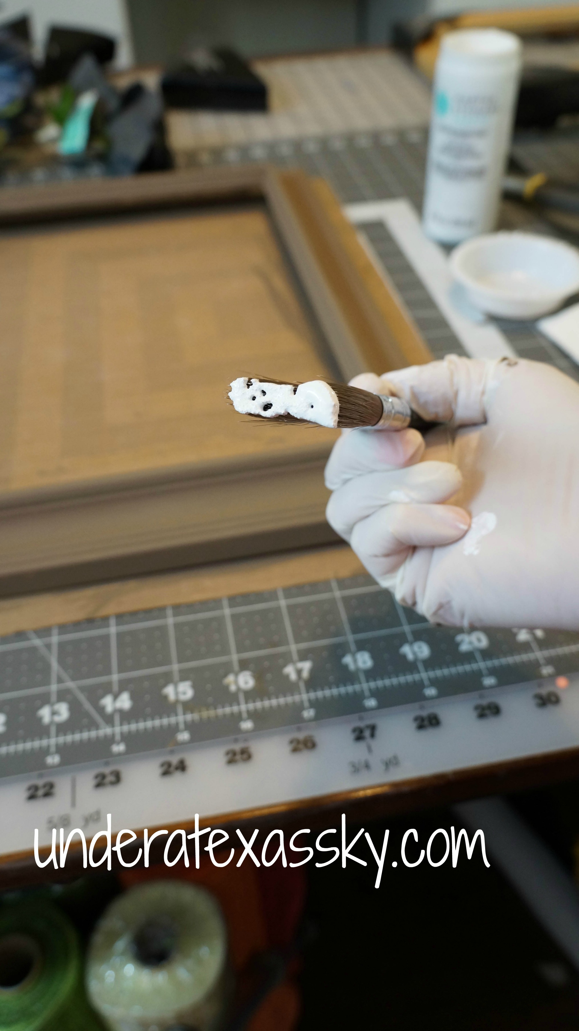 This is not a difficult technique- but you do need to be careful when you first touch the brush to the surface you’re painting. You need a feather light touch- working in the groves first is probably the best place to start. I was rocking along pretty well, and then this happened:
