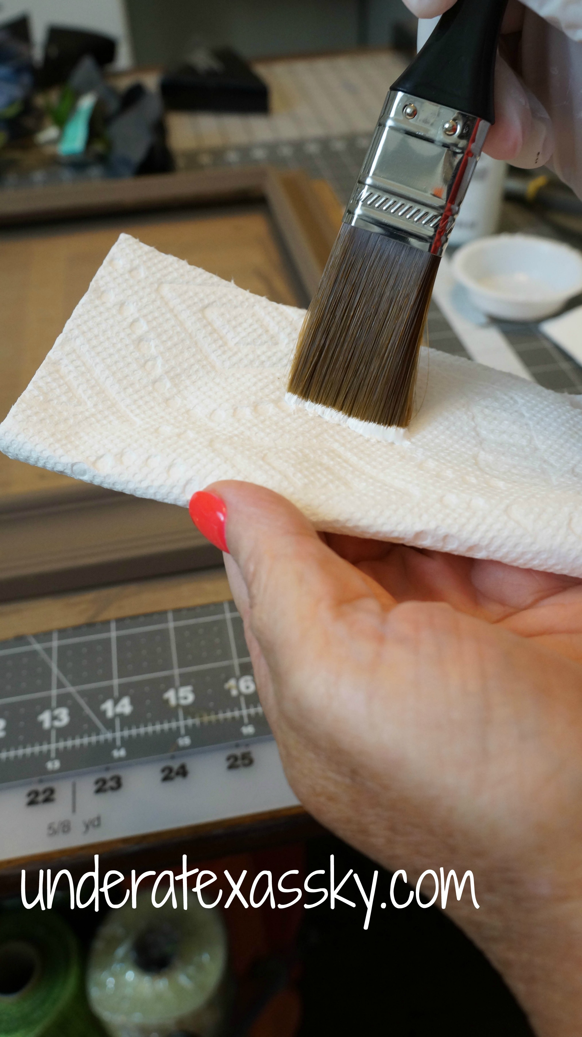 Then add the lighter color paint using a dry brush technique. Dry brushing is just what it sounds like. It’s using a brush that is almost dry; there’s just a dab of paint on the bristles. I shook up the paint and just used the paint that had pooled on the lid. It’s really plenty for this. Dip your brush in the paint that’s on the lid, then dab most of it off on a paper towel. The key is to get the brush pretty dry and then use very light strokes.