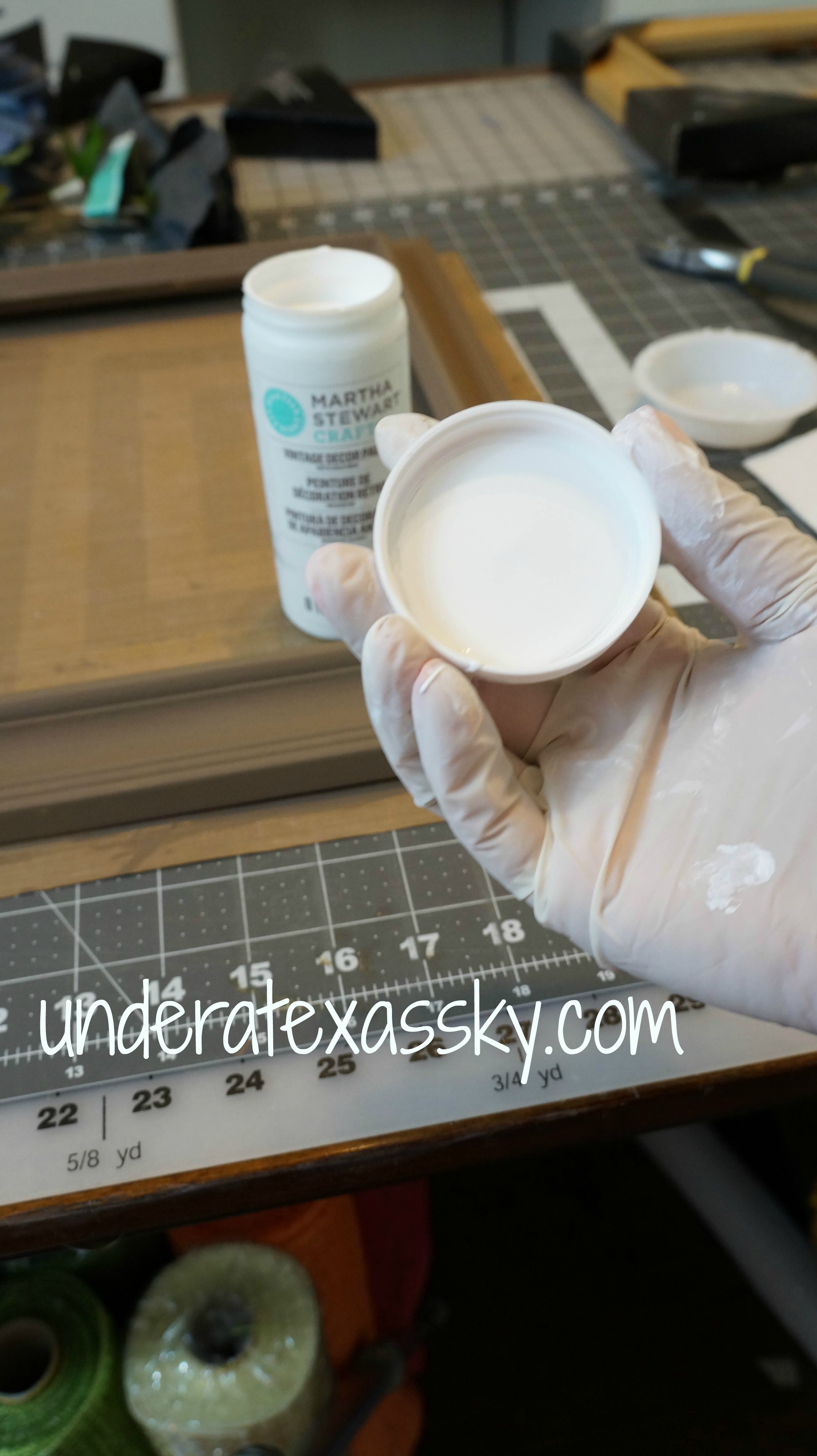 Start with a raw wooden frame. I couldn’t find a crackle glaze at the hobby store so I decided to do a dry brush technique to give the frame some visual interest. A chalk paint gives great coverage, I used a Martha Stewart brand. The colors I went with are called Tilled Soil for the base and Wedding Cake for the dry brush over it.