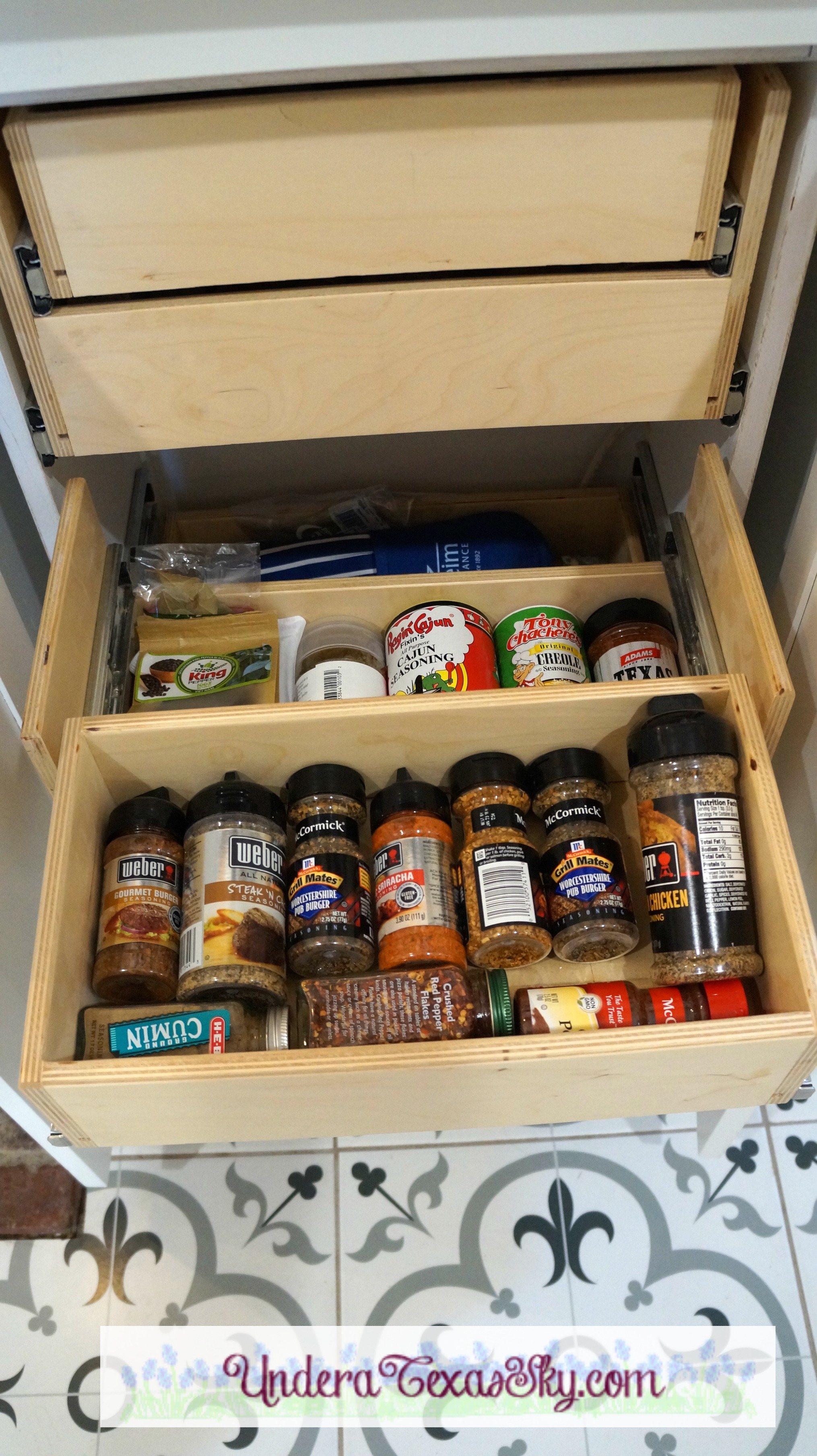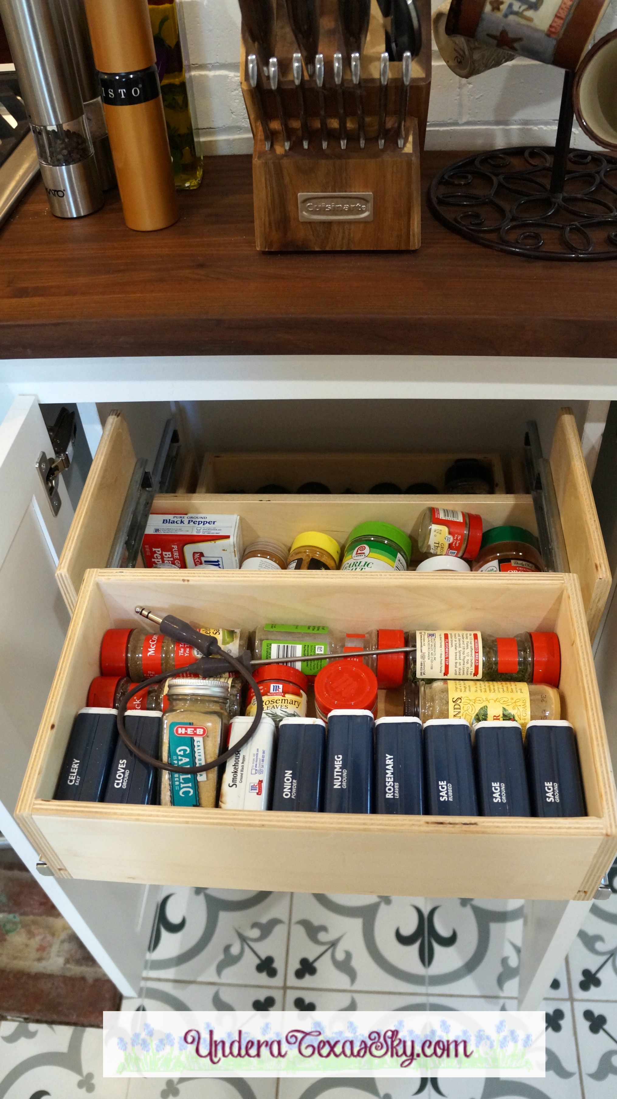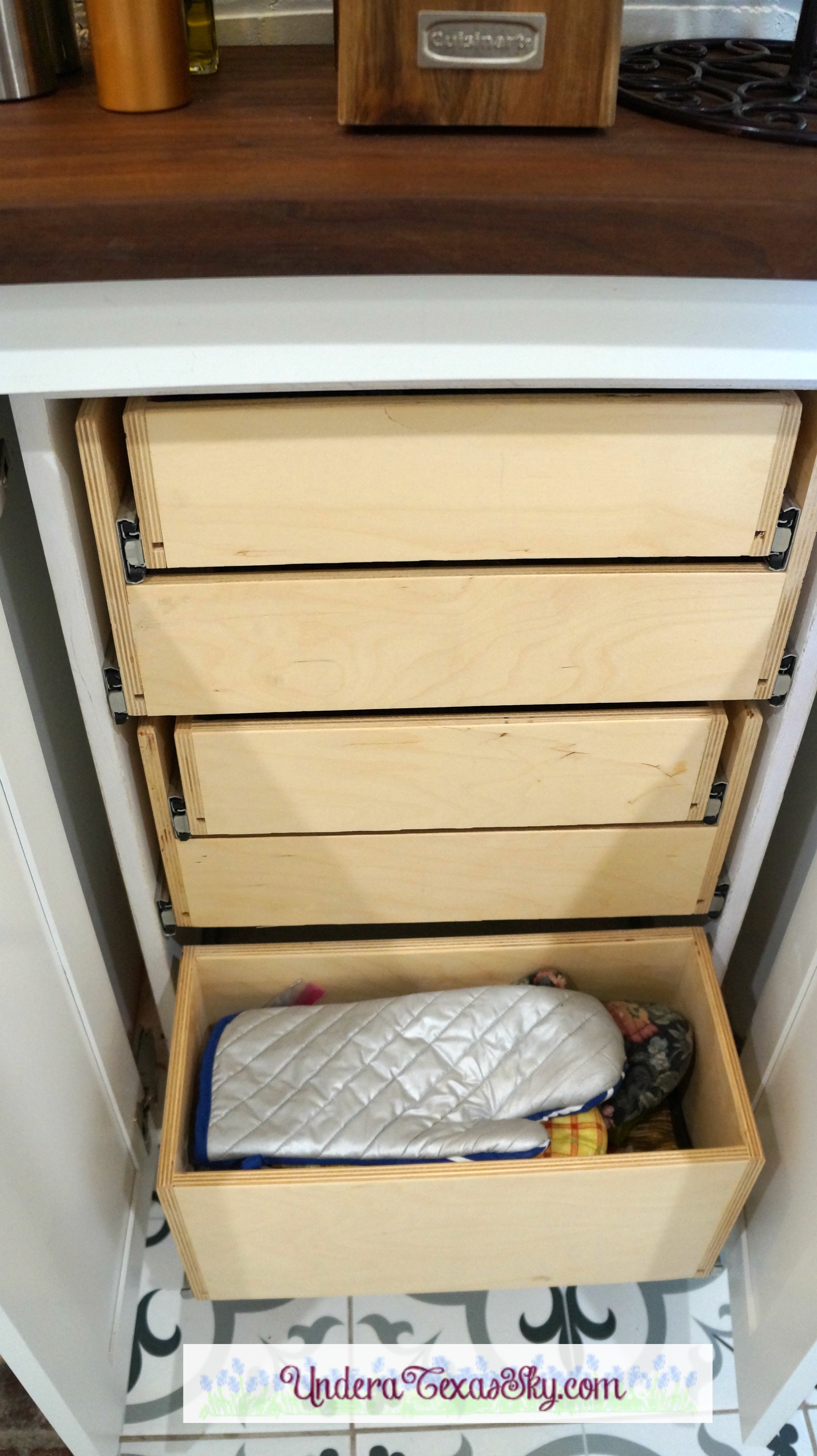 There was an empty space in front of the brick column. We didn’t want this space to go to waste so the cabinet guys designed a smaller cabinet to go there. They crafted a beautiful walnut cutting board to top the cabinet. Not wasting a bit of space, they also created a spice drawer system that fit the shallow cabinet perfectly. The drawers are hinged and double as they pull out. Most all of my spices fit perfectly. There’s even a drawer to hold my pot holders!